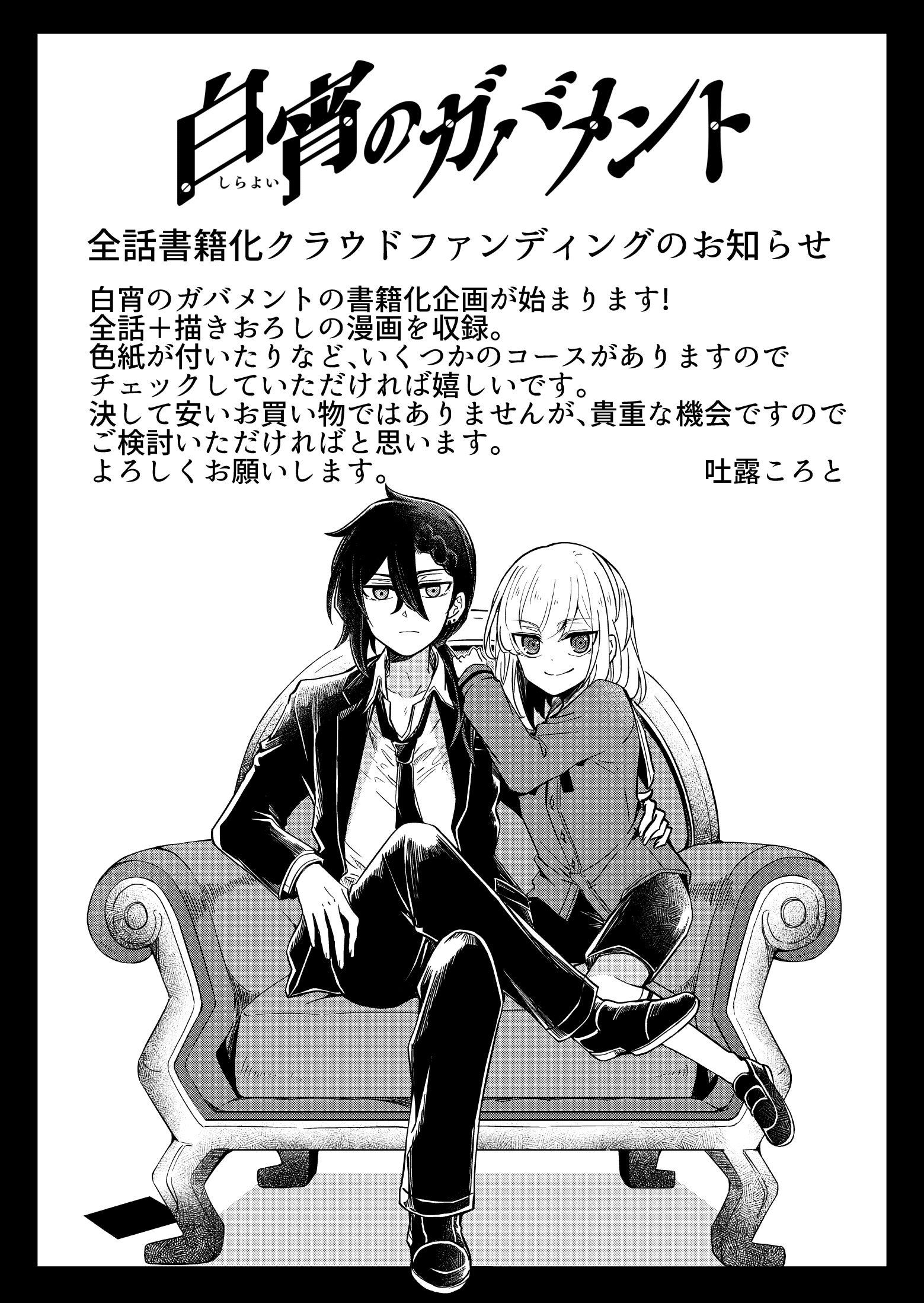 2021/11/22 02:11平素よりお世話になっております。GANMA!グッズ化事務局でございます。この度『白宵のガバメント』全話書籍化プロジェクトにつきまして未達成にて終了となりました。ご支援、ご声援いただいた皆様に大変感謝すると同時に、お手元に届けることができなかったことを深くお詫び申し上げます。尚、支援金に関してはCAMPFIRE社より以下の内容で対応が行われます。・コンビニ、銀行支払いの場合、本日より最大16日以内に、ご登録いただいた返金用の銀行口座に入金させていただきます。・他支払い方法におきましては、決済がキャンセルとなり引き落としが行われません以上です。重ねてではございますがこの度はご支援、ご声援いただいた皆様に大変感謝申しあげます。今後とも吐露ころと先生へご声援いただけますと幸いです。今後ともよろしくお願いいたします。 もっと見る表紙デザインのラフ画を公開!