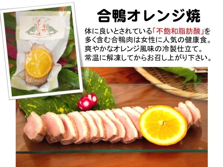 原材料名 合鴨、塩、胡椒、食用植物油脂、オレンジ