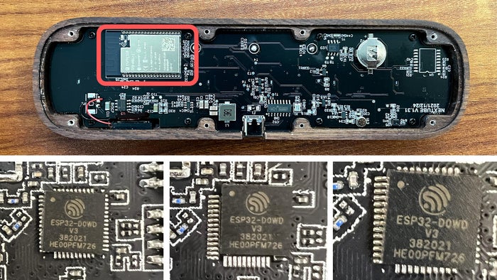 しかし、最初のロットの生産の過程で、制品の不良率は10%に達して、私達はとても心配して、そこで生産を停止して、このような高い故障率の原因を探し始めました。結局、原因はPCBを貼り付ける過程で温度制御がうまくできなかったため、esp32-wrover-eチップのモジュール部分にあるマスターチップが歪んでしまい、それで制品が使えなくなってしまったのがわかりました。このマスターチップは外側が鉄の殻で覆われているため、だからこういう問題が発生しても発見されしにくいんです。