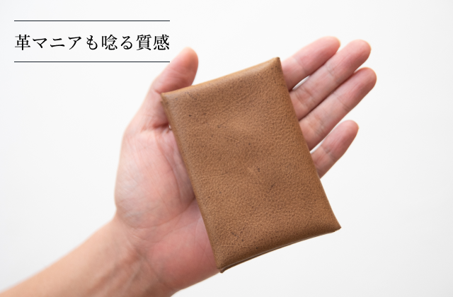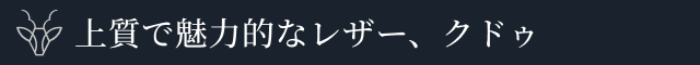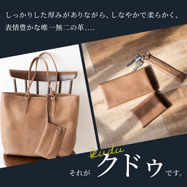 クドゥのレザーは、牛革の「強さ」と鹿革の「しなやかさ」をあわせ持つ非常に上質なレザーです。厚いのにしっとりもっちり、手に吸い付くような柔らかさを感じることができます。まるで使い込まれたレザーのように手にとってすぐ馴染むアイテムは、レザーマニアの心を奪う逸品です。