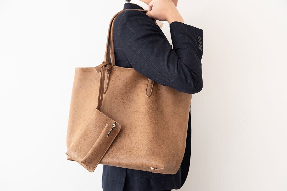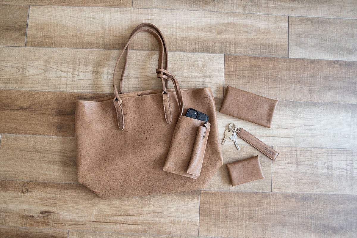 付属するのは、同じ革から仕上げたオリジナルのポーチ。アイフォンなどのスマホや手帳、眼鏡、財布といったすぐに取り出したいものが収納できます。脱落防止としてバッグにぶらさげることができます。ポーチには個人名入れを施すことができます。
