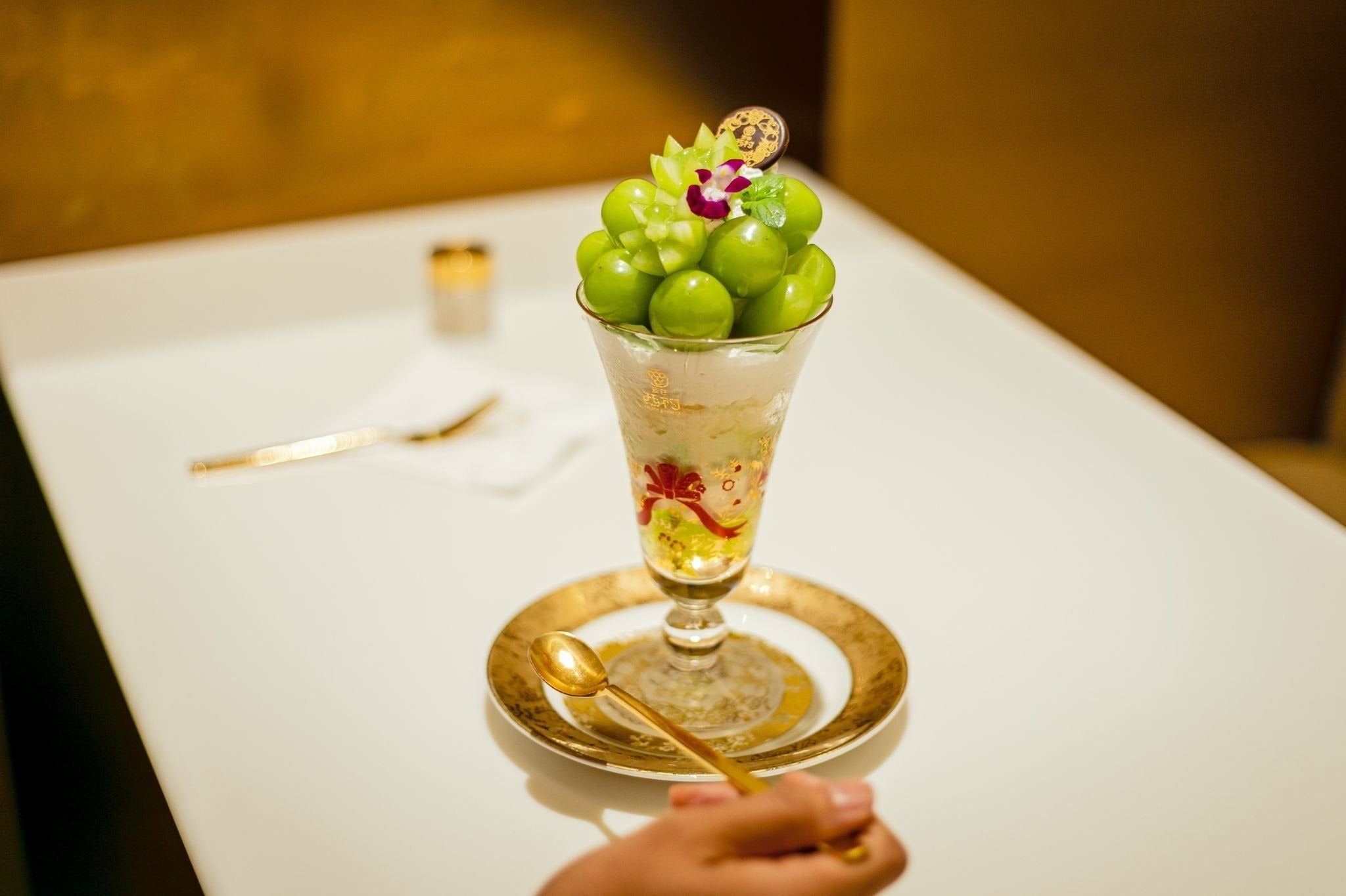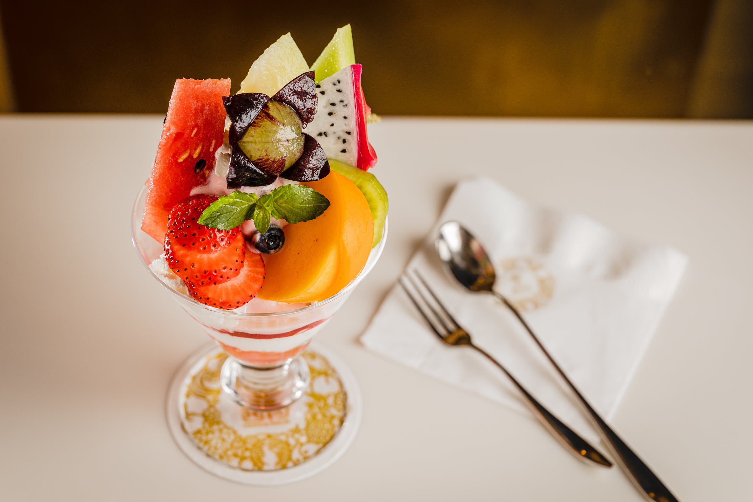 特に特選パフェは、使用するフルーツのクオリティはもちろん、金色をあしらったオリジナルデザインのパフェグラスやスプーンなどのカトラリーにいたるまで、特別感を演出。