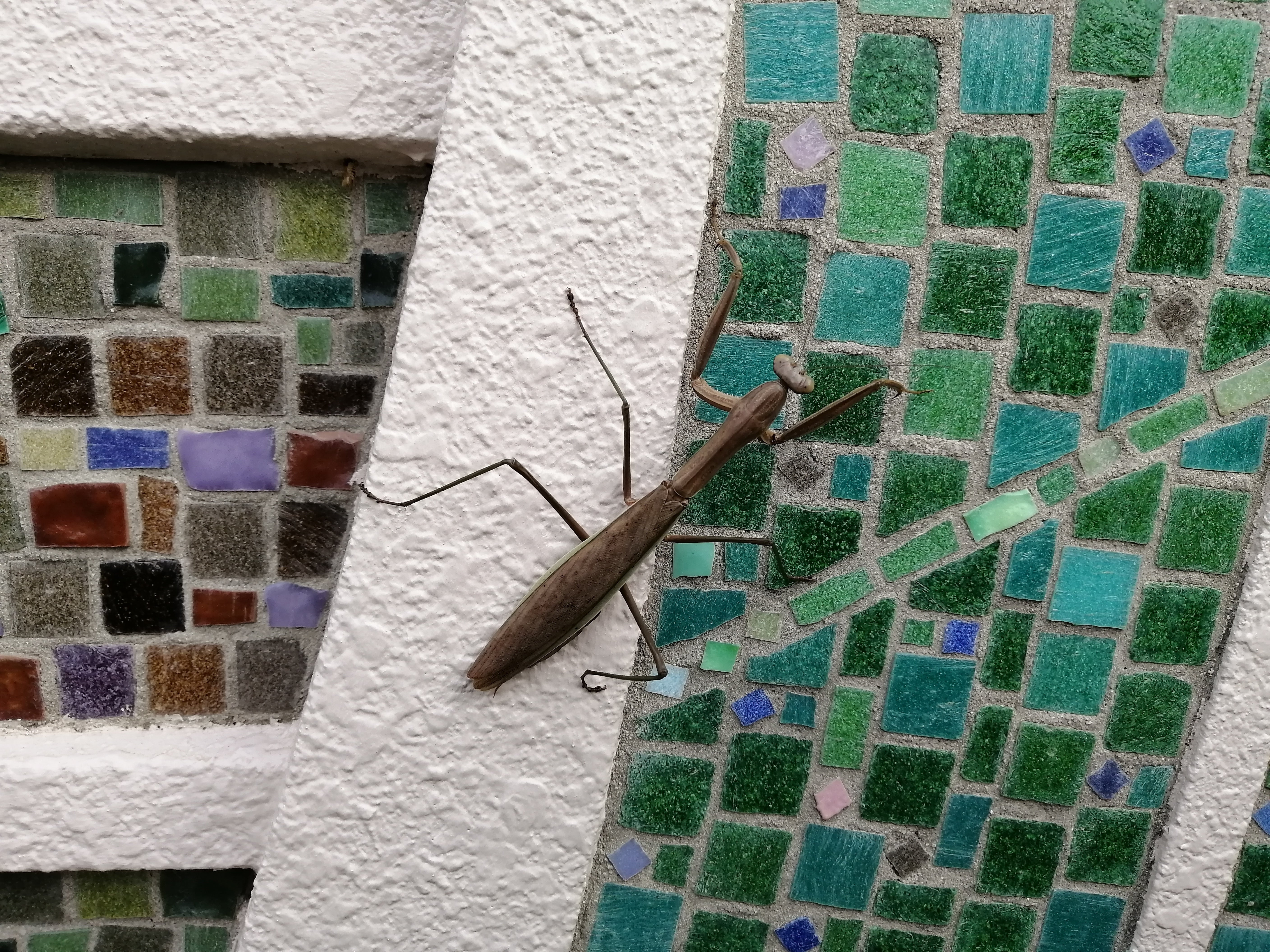 私が務めているしょうがい者施設のタイルアートの壁に、今日、オオカマキリが居ました。