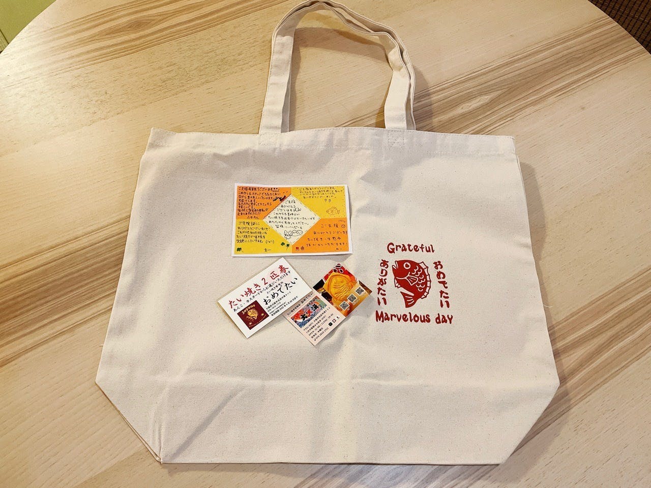 リターン品「たい焼き2匹引替券」と「オリジナルトートバック」を、昨日発送いたしました。