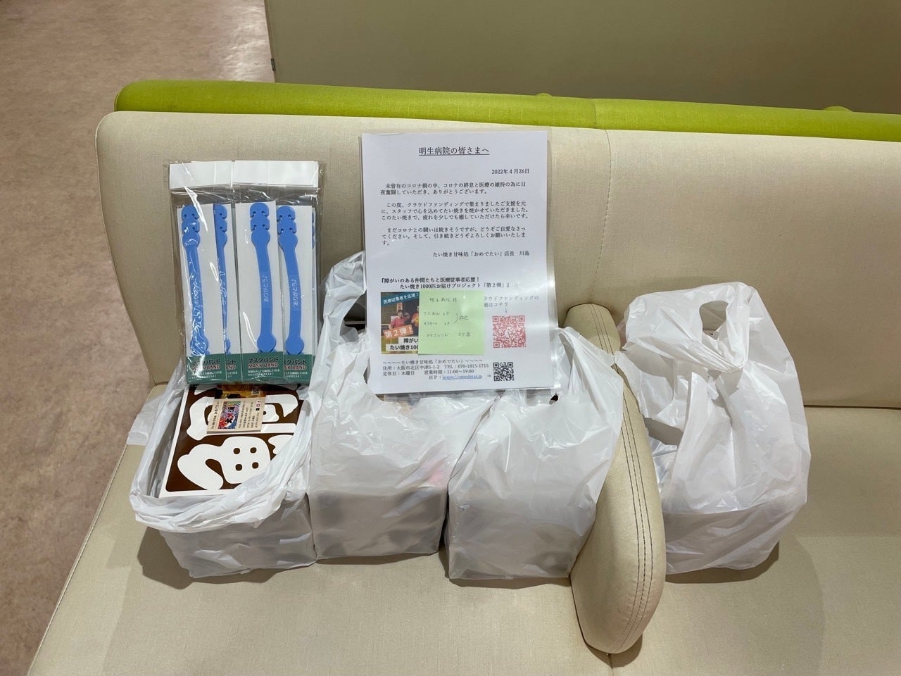 4月26日に、明生病院に「たい焼き50匹」「マスクバンド25本」をお届けしてきました。