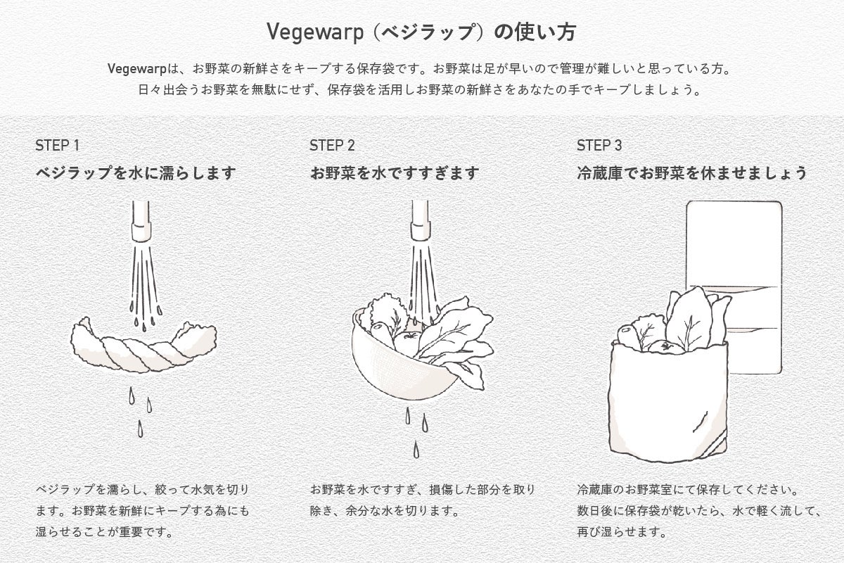 Vegewrapは、布製なので、繰り返し洗ってお使いいただけます。従来の野菜保存袋は、プラスチックなことが多く、また一度使うとすぐにゴミになってしまうものばかりでした。ただスーパーなどで多く見られている野菜は、プラスチックの袋に入っていて、これが日持ちをさせるために、非常に重要で、バラで購入したり、一度袋から出すと、すぐ野菜がしおれてしまいます。
