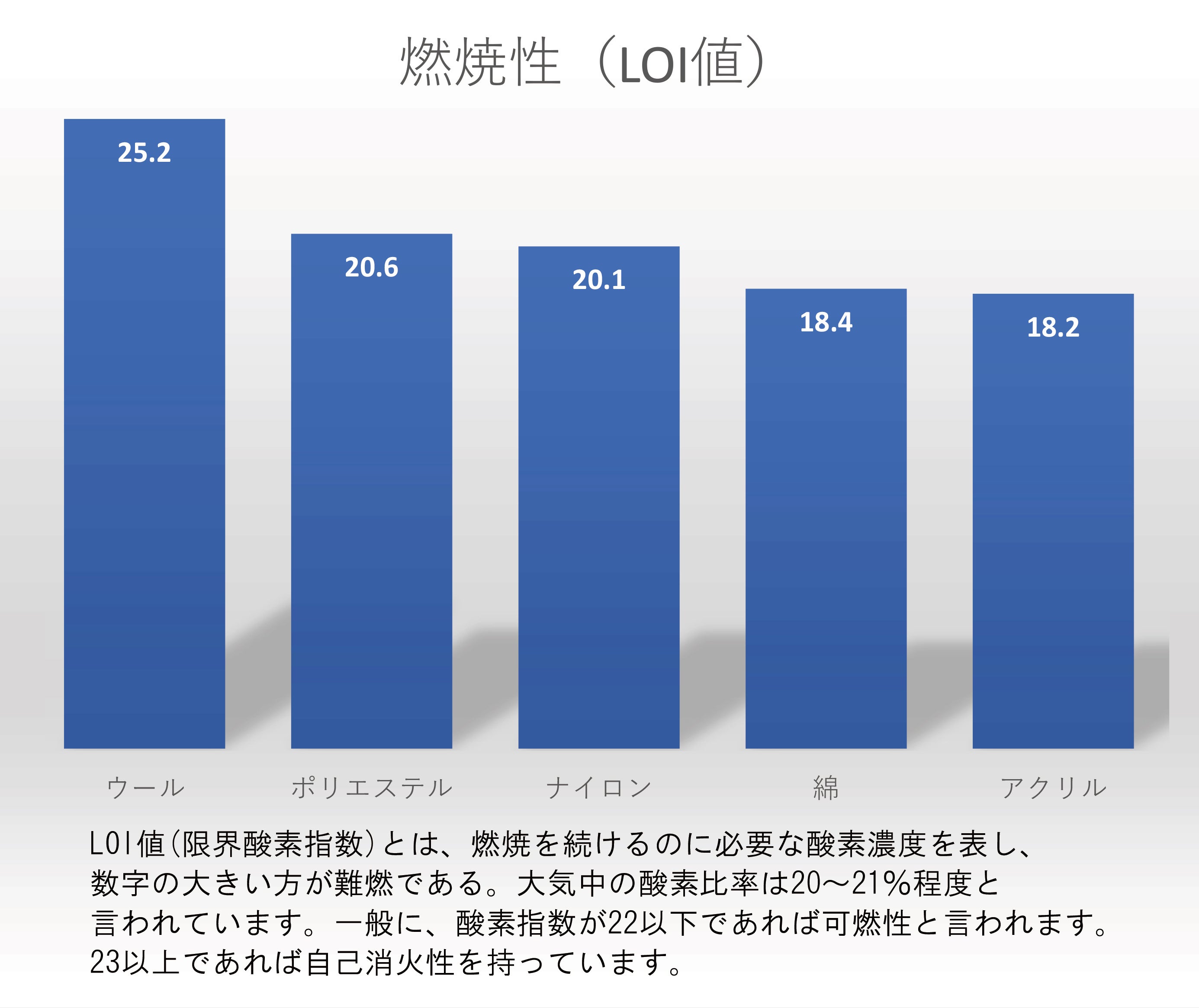 下の図のように、ウールは他の繊維に比べ燃えにくい繊維です。また、燃えても、化学繊維のように溶融して燃え続けることはありません。ウールでは、燃焼部分が炭化する(焦げる)だけで、比較的短い時間で燃焼はおさまります。キャンプ用のブランケットに最適な繊維です。