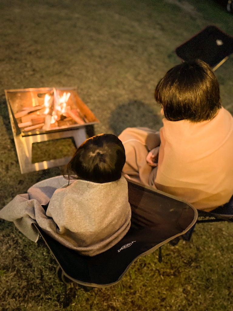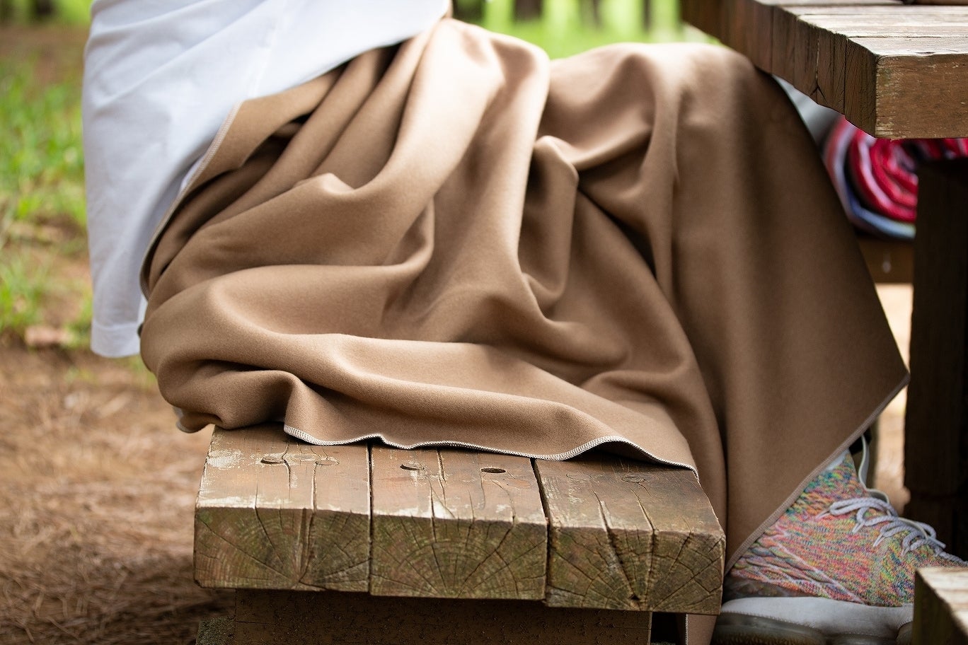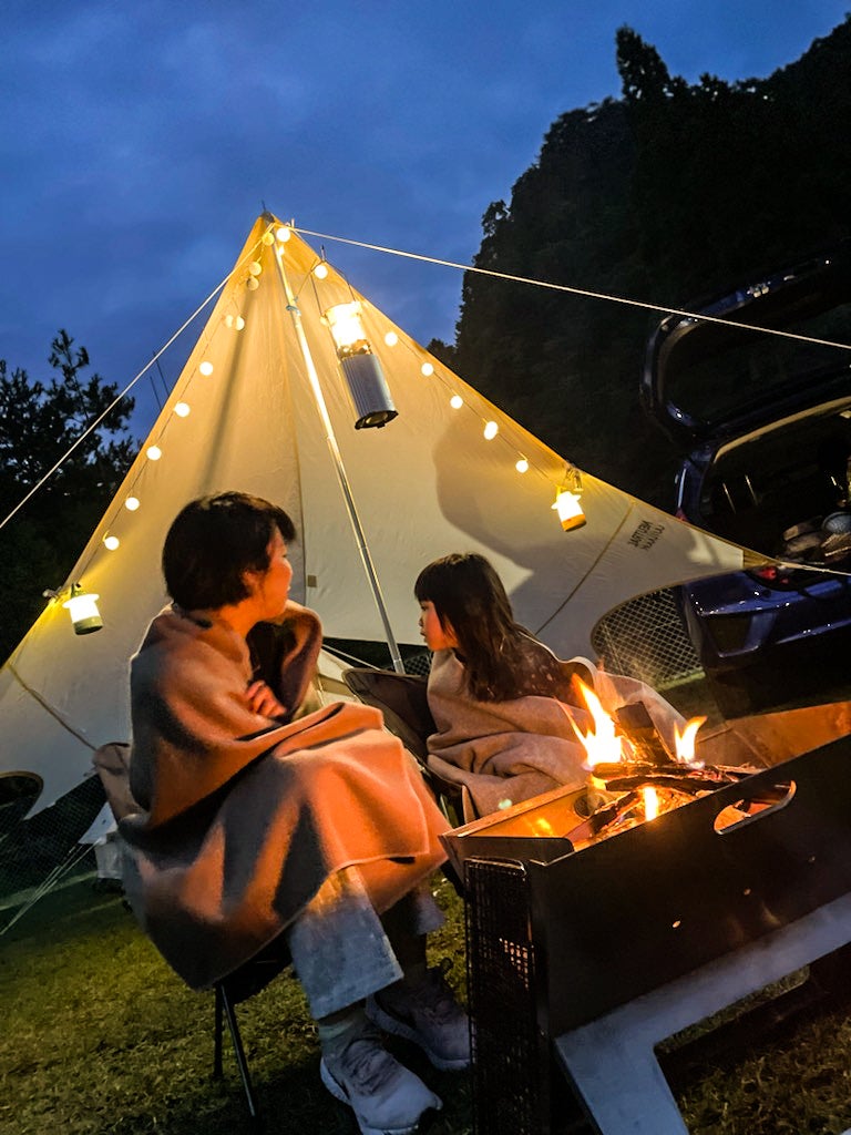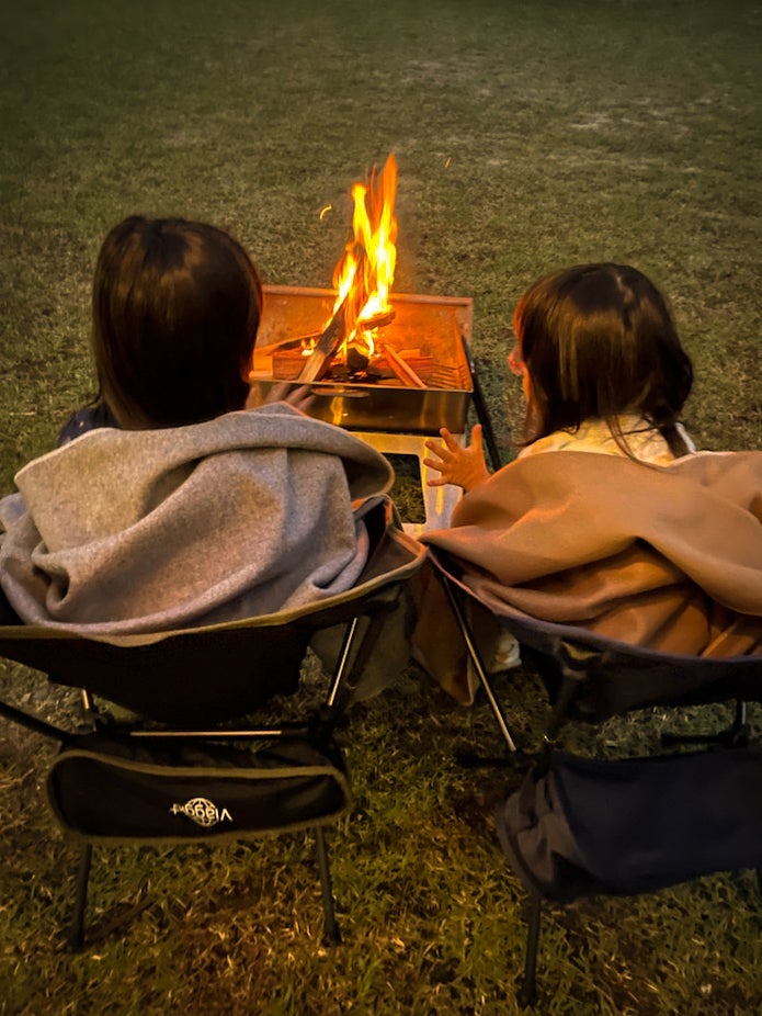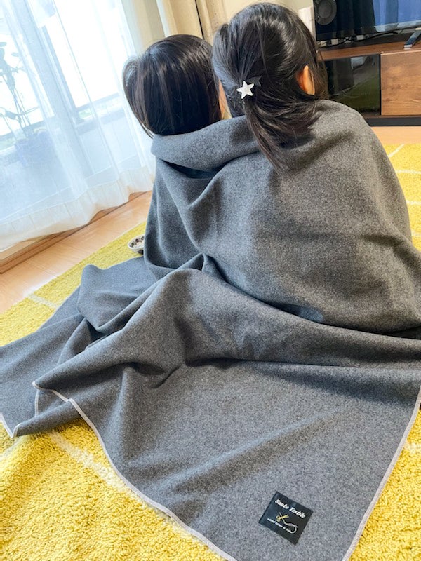 キャンプファイアでは子供たちと一緒にくるまり、寝るときには下に敷いて