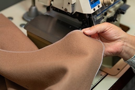 生地の縁を縫製します。シンプルな加工ですが、当社の熟練の技術者により、