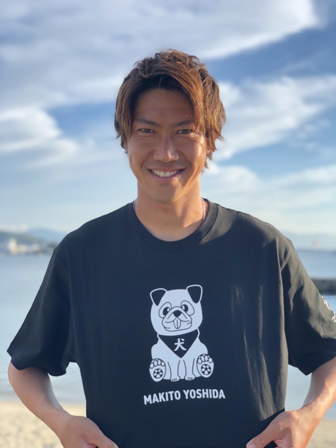 焼けた肌に背景の海がベストマッチな吉田選手。着こなしもバッチリですね!