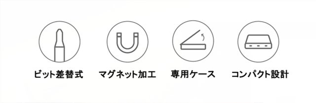 手に馴染みやすく、上部に早回しキャップが付いて力を加えやすいハンドルを採用します。磁力でビットをしっかり吸着し、先端にはマグネットがついているのでビット交換も楽です。そしてビット先端もマグネットになっており、大事なネジを落としてしまうリスクを低減しています。