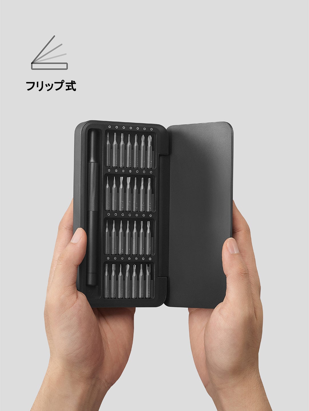 専用のケースにはマグネット式のビットが収納できるようになっており、着脱も簡単です。さらにケースには飛散防止板があり、1つ1つのビットがバラバラにならないように工夫されています。フリップ型の収納ケースはフタ部分のマグネットによりしっかりと閉まります。その上バネが仕込まれた特殊構造で半自動開閉もできます。