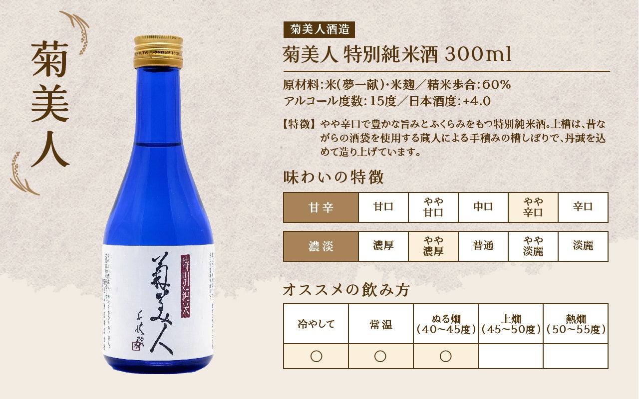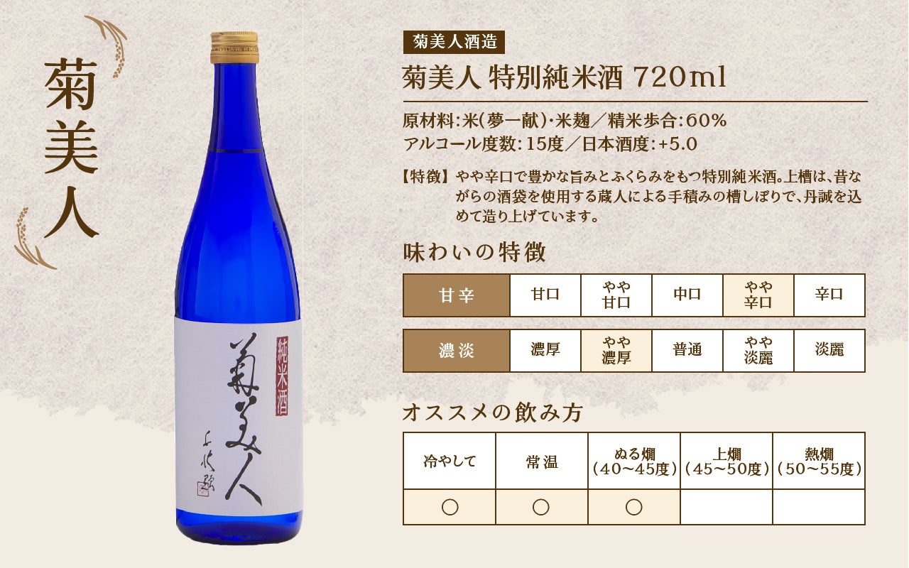 菊美人酒造は1735年、江戸期創業。現蔵元は九代目、屋号は薩摩屋。六代目蔵元、江崎喜三郎の妻、加代は柳川の詩人「北原白秋」の実姉にあたり、白秋は「菊美人」を墨書し、三幅の扁額を遺した。爾来「菊美人」は白秋の命名と世人は伝える。