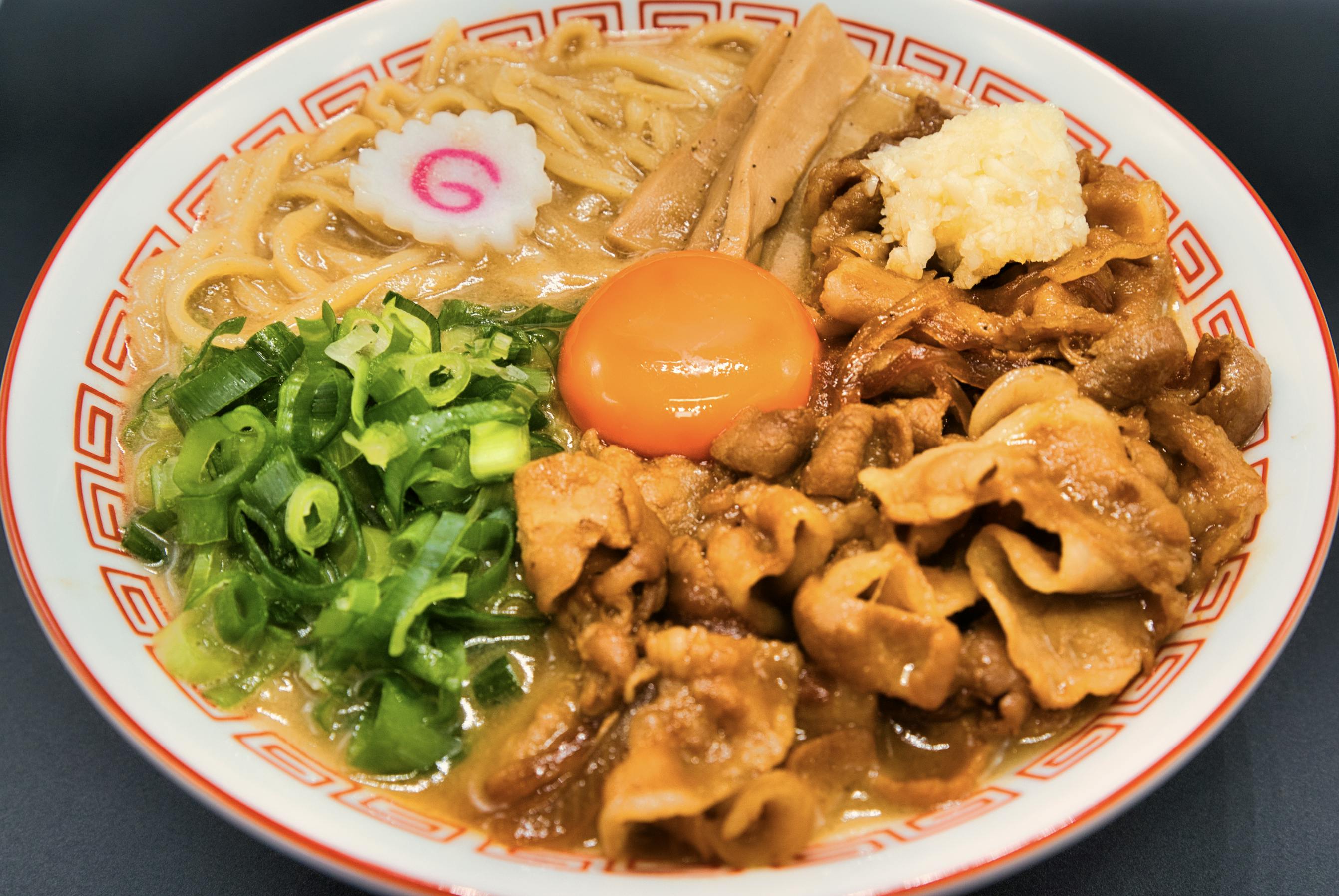 「鶏」「豚」「牛」の3種類もの動物系をブレンドした贅沢で濃厚な三獣スープ。使用する麺は、北海道小麦 「春よ恋」を使用した中太平打ち麺。 甘辛く炒めた豚バラ肉もトッピングした満足の一杯!