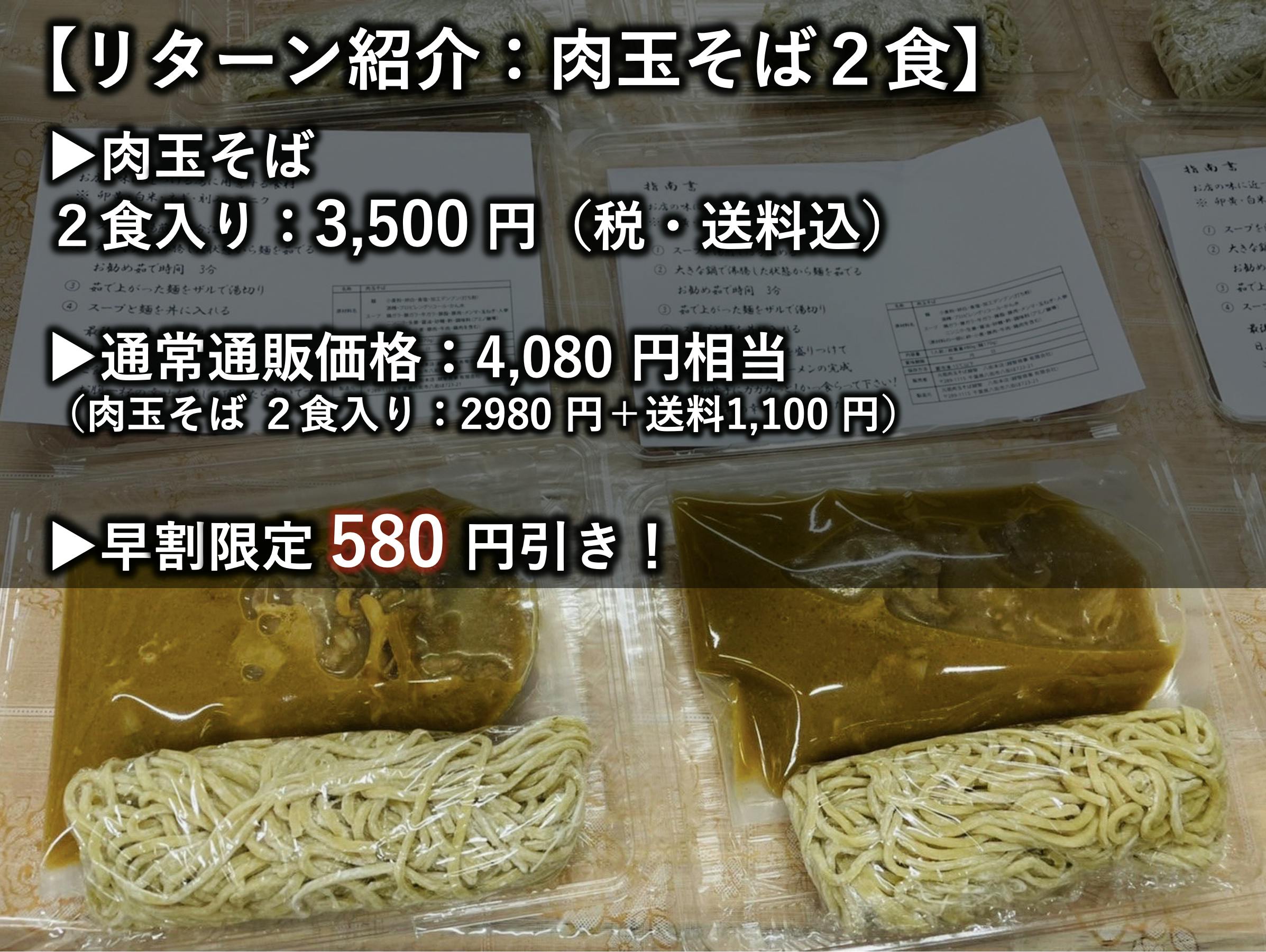 ▶︎リターン⑤ 肉玉そば3食分、肉玉つけ麺3食分をお届け!