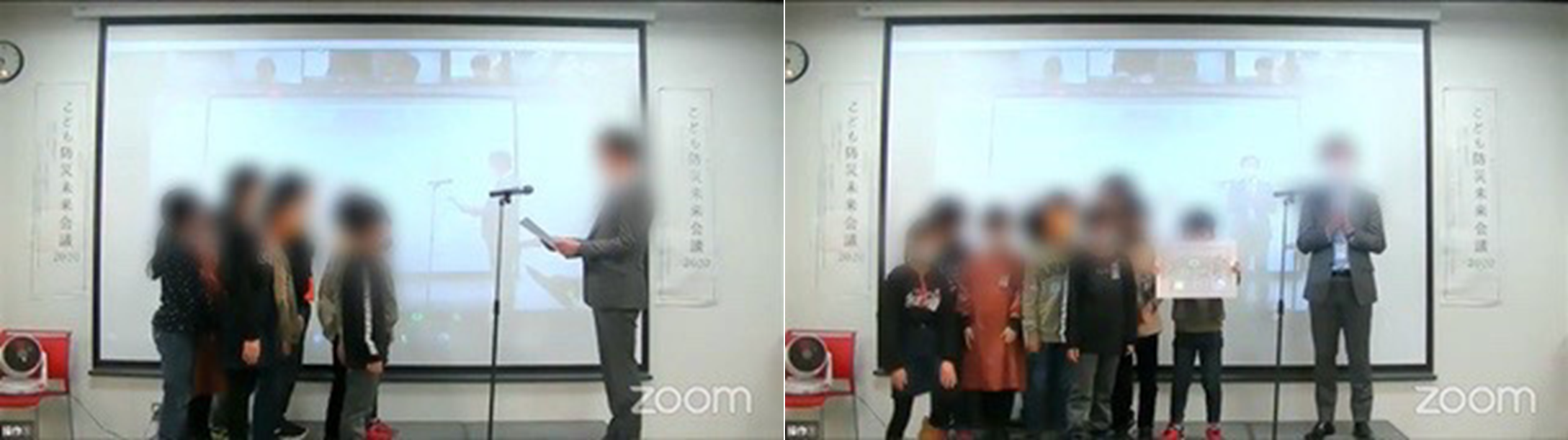 計104作品の防災かべ新聞の審査を終え、部門別(小学校中学年の部・小学校高学年の部・中学生の部)に会場・オンライン上での表彰式を実施しました。プレゼンターが表彰状を読み上げ、画面上に受賞した子どもたちの顔が映されると参加者全員から拍手が!!受賞した子どもたちは照れながらもニコニコと手を振って、とても嬉しそうでした♪今年も力作ぞろいで、審査員の皆さんをうならせる素晴らしい作品ばかりでした!