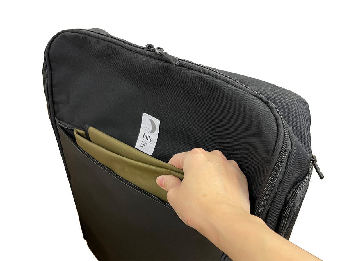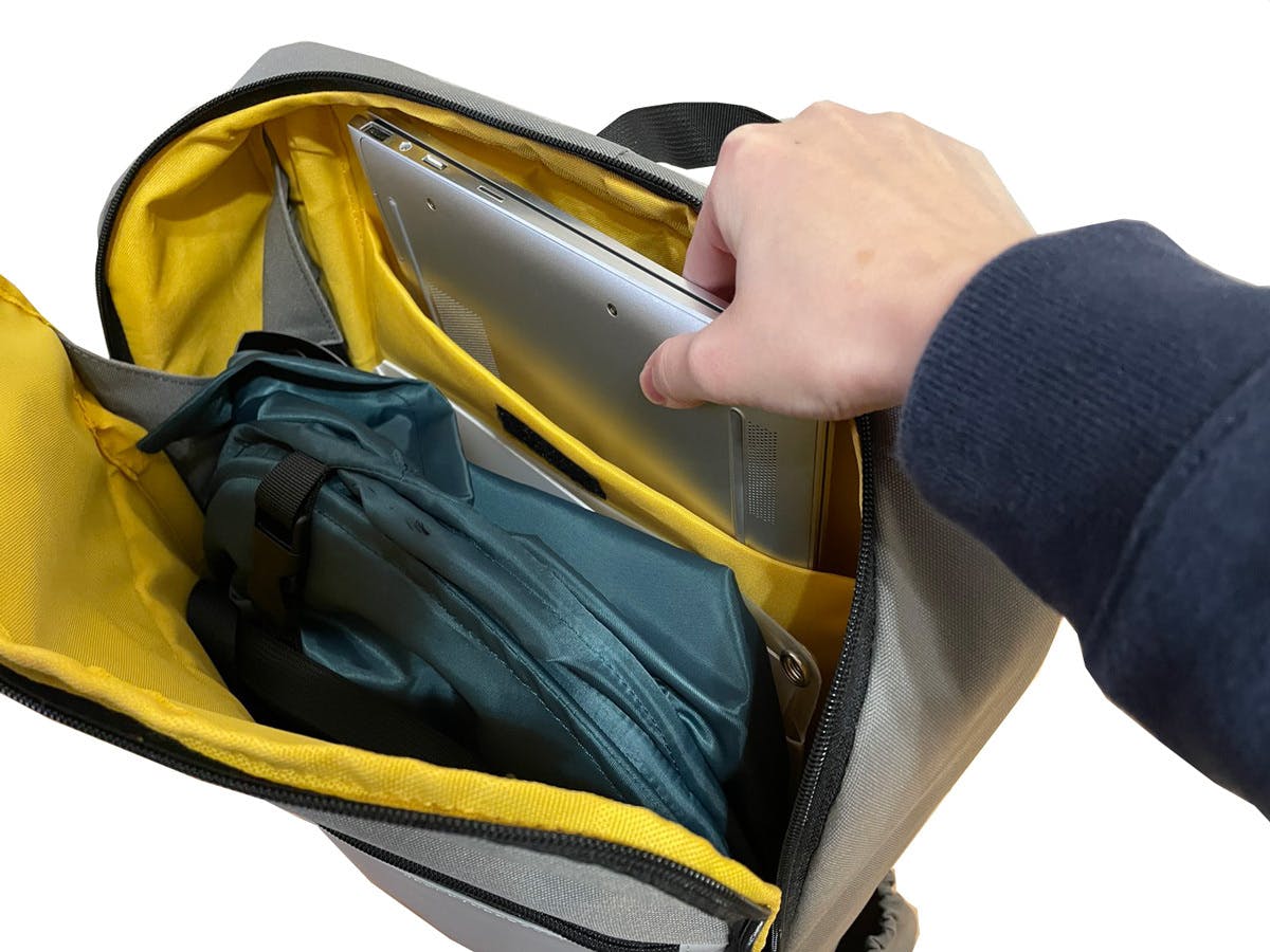 リュック自体がチェアになるため、PCやノートなど必要なものを入れて、