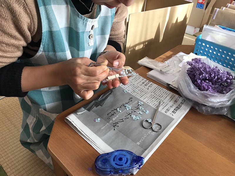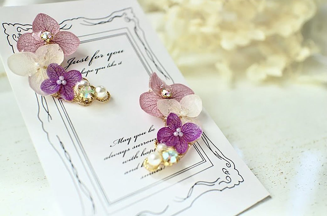 まず、プリザーブド加工されたあじさいの花びらを使って、レジン加工を施すことによりピアスやイヤリング・イヤーカフなどといったアクセサリーをつくられているハンドメイド作家さんと知り合うことができました。