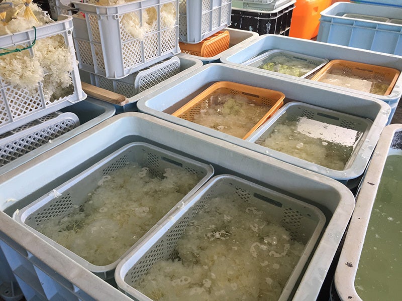 立ち枯れしたアナベルを収穫した後、乾燥させてから、特殊な技術でアナベルの色を真っ白に漂白加工していきます。