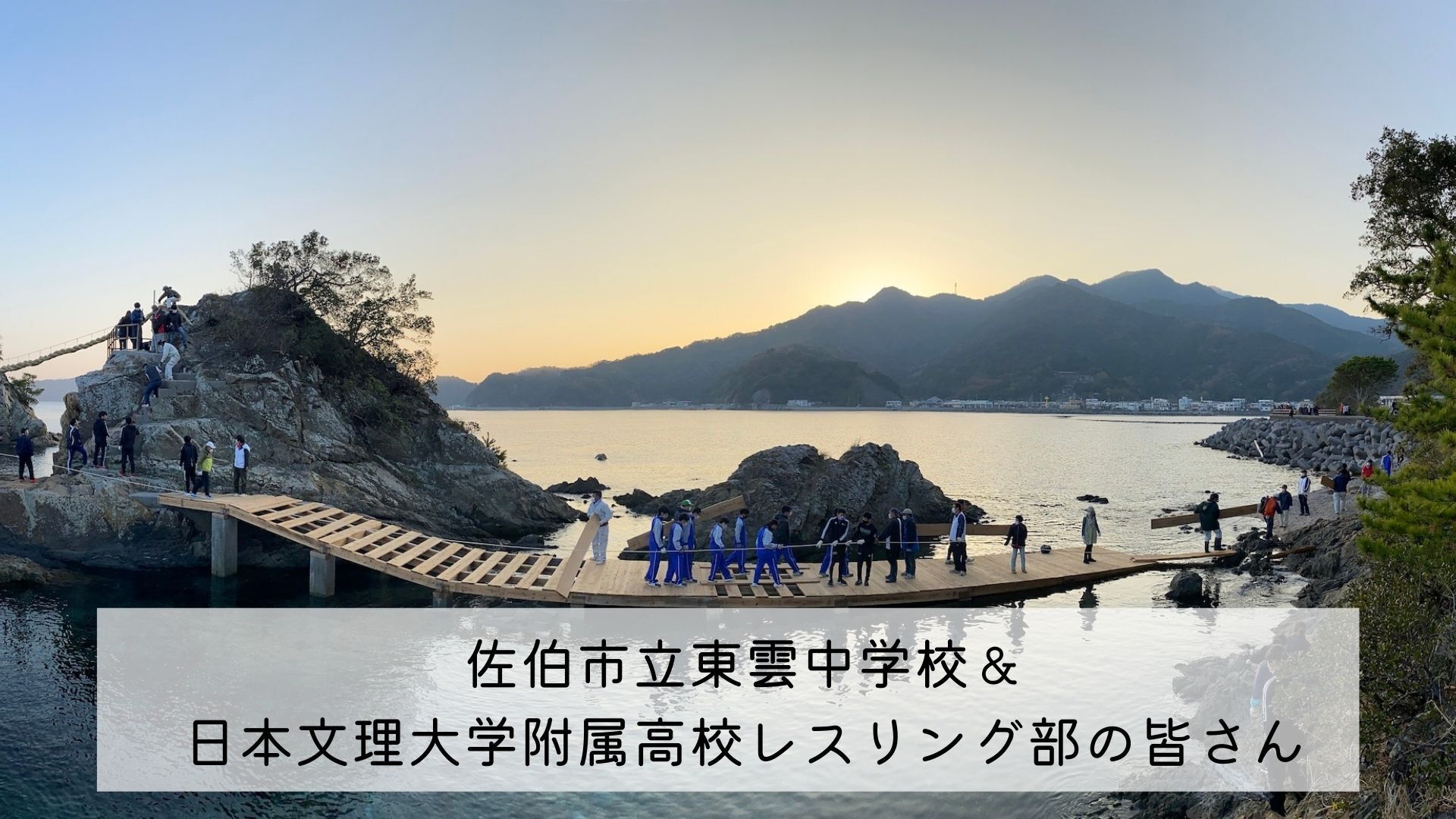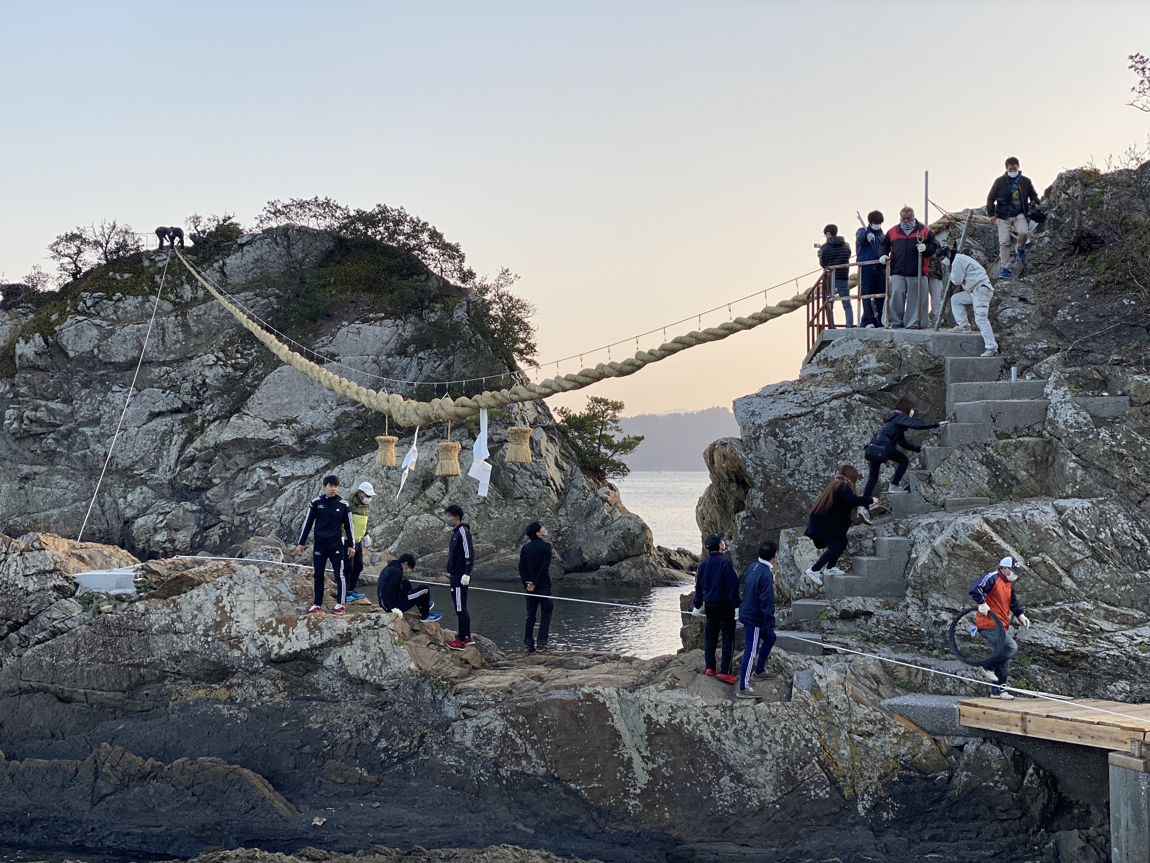 海から飛び出た2つの岩にしめ縄を張り直すため、毎年『作業用の仮設橋』をかけていますが、