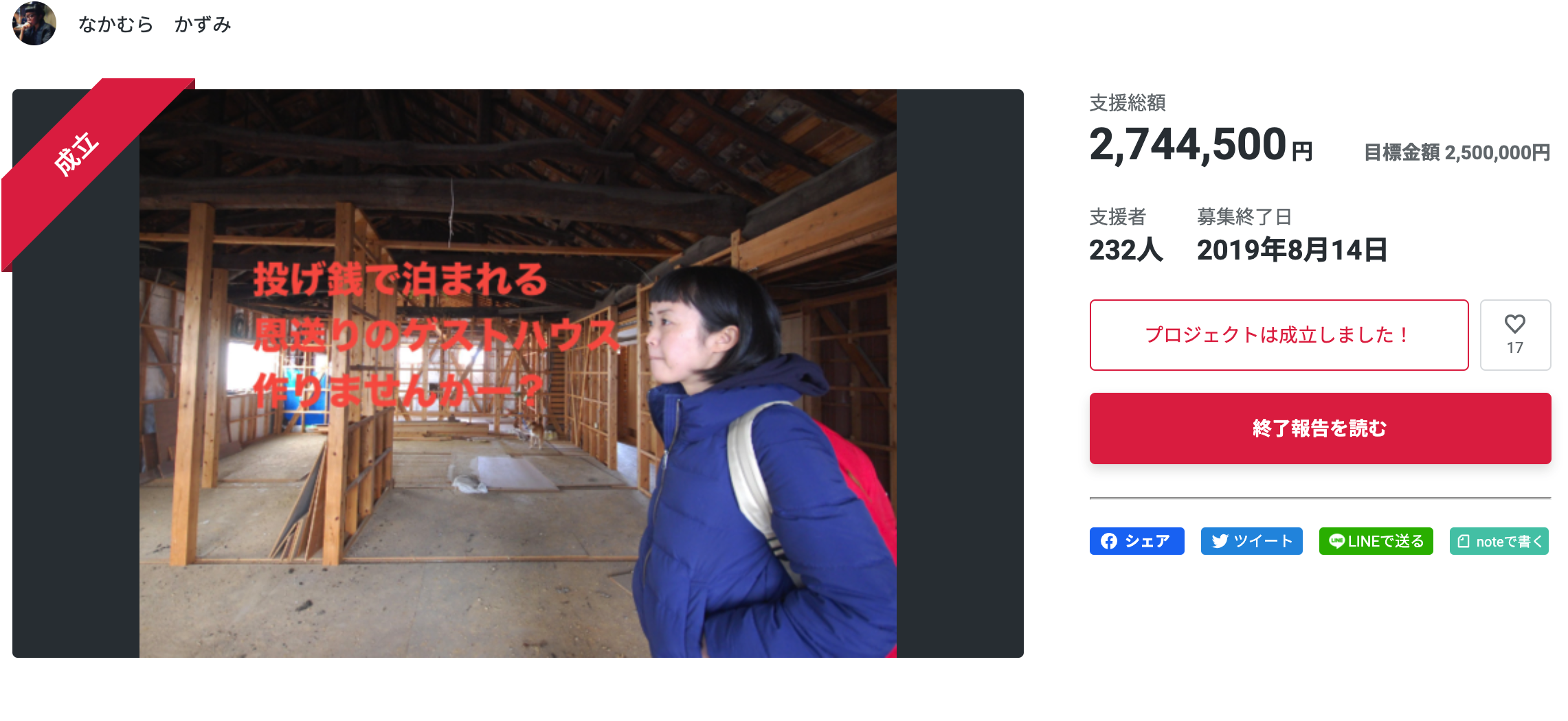 2021/11/19 21:10こんにちは!はじめまして。ページをご覧いただきありがとうございます。なかむらかずみと申します。今回のクラウドファンディングの記事作りを担当しています。2017年に縁もゆかりもない佐伯市に移住してきて、地域おこし協力隊として3年間市役所で働いていました!現在は佐伯市内でゲストハウスを経営しています。2019年に、空き家を改修してできあがったゲストハウスです。開業時に、借入だけでは改修費用が足りず、250万円目標のクラウドファンディングを実施しました。佐伯の人をはじめ、本当にたくさんの方に支援していただき、ありがたいことに270万円ものお金が集まりました。たくさんの人に応援していただき、資金調達が目的だったにも関わらず、『一歩踏み出してみることの大切さ』『人に頼ることの素晴らしさ』『助けてくれる人の温かさ』など数字では決して見えないものを身をもって体験させてもらいました。そして今度は自分が応援する側に自身のクラウドファンディングの経験をきっかけに、「クラウドファンディングをもっともっと気軽にしていい世の中にしたい」と思いました。だけど、そこには何かをやってみたい、と思う人の気持ちとやる気、人やお金を集められるだけの魅力がなければ何も始まりません。「やってみたい」と思う人「応援したい」と思う人がいて、初めて成り立ち、それが金額という数字として見える。すごく面白いし、それで「やってみたい」ことが実現できたらこの世界はもっともっとワクワクする。だから、この豊後二見ヶ浦の遊歩道整備のクラウドファンディングについて実行委員会から相談があった時、すぐ「やりましょう!」と答えました。こんなにたくさんの人の歴史と気持ちを背負った場所のアップデート!どんどんしたい!もちろん、何を始めるにも困難は絶対にあるけど、困難に目を向けて「できない、ショボーン」となってしまってはつまらない・・・。担当の方が「やってみたい」と私に相談に来てくれたのだから、私なりに全力出そうと思います!ーーーーーーーーーーーーーーーーーーーーーーーーと、記事本文を作りました!写真を撮りに行き、取材に行き、編集して、修正して大切にできあがった記事です。が、このクラウドファンディングが募集を始めて数日・・・あれれ?全然支援が集まらない。友人に相談したところ「中の人が見えない」「結局、誰のことを応援しているのかが見えない」と言われてしまいました。ガビーン。何度も何度も読み返し、書き直して作ったはずのページだったけれど・・・確かに!たくさんの立場の人が関わり、チームで動いていることのデメリットの部分が露呈してしまっていました。豊後二見ヶ浦の歴史や、現状はわかる記事だけど「今」「誰が」挑戦しているのかが見えてこない。そこで・・・チームのメンバーを紹介していくことにしました!『活動報告』の場を借りて、「中の人たち」の声をどんどん発信していこうと思います。一人でも、「この人のためなら」と思える人を見つけたら、ご支援をお願いいたします! もっと見る