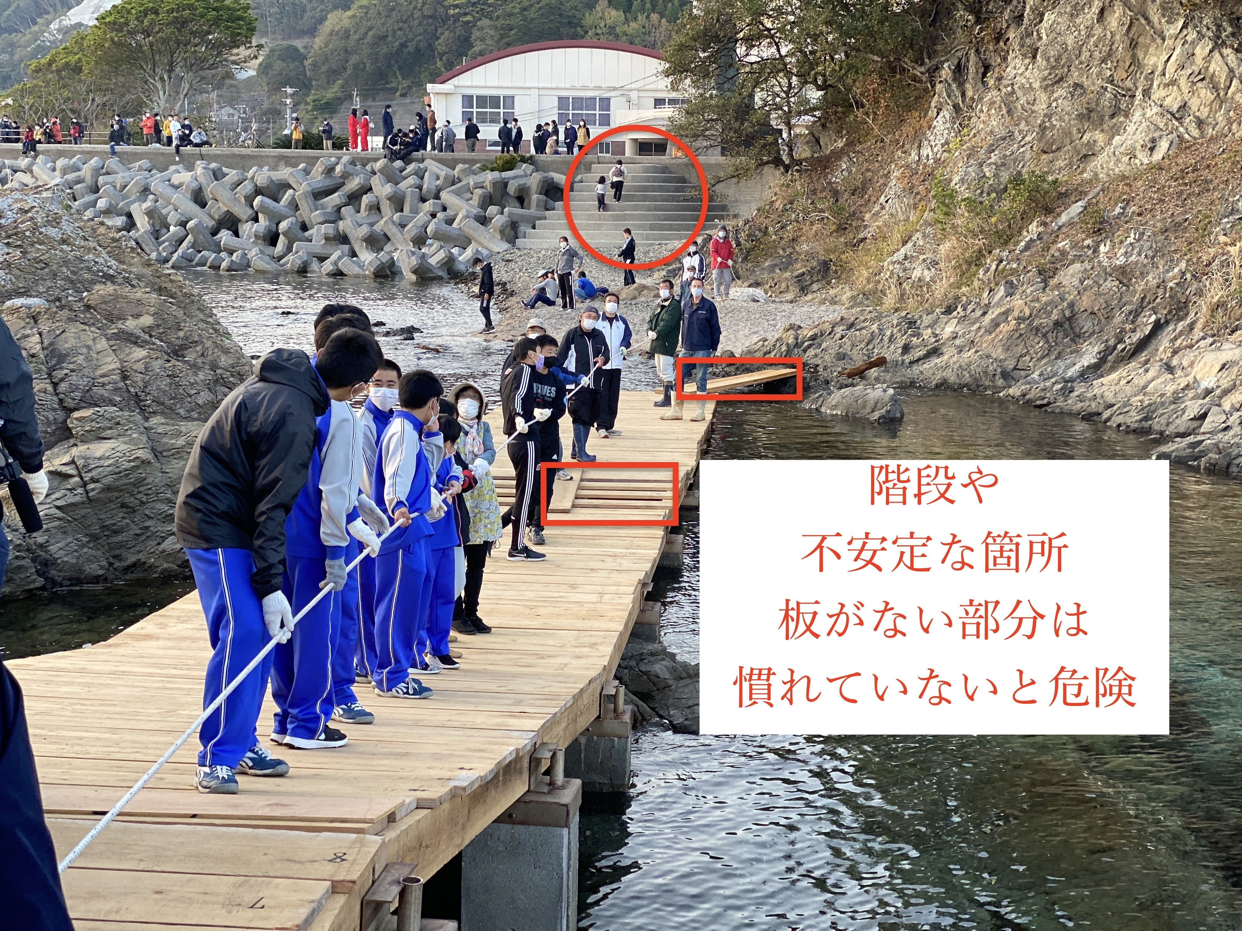 仮設の橋に行くまでには段差の大きな階段、橋自体は最低限の設備であるため、大しめ縄を夫婦岩まで運ぶ作業をする人たち以外は入ることはできません。