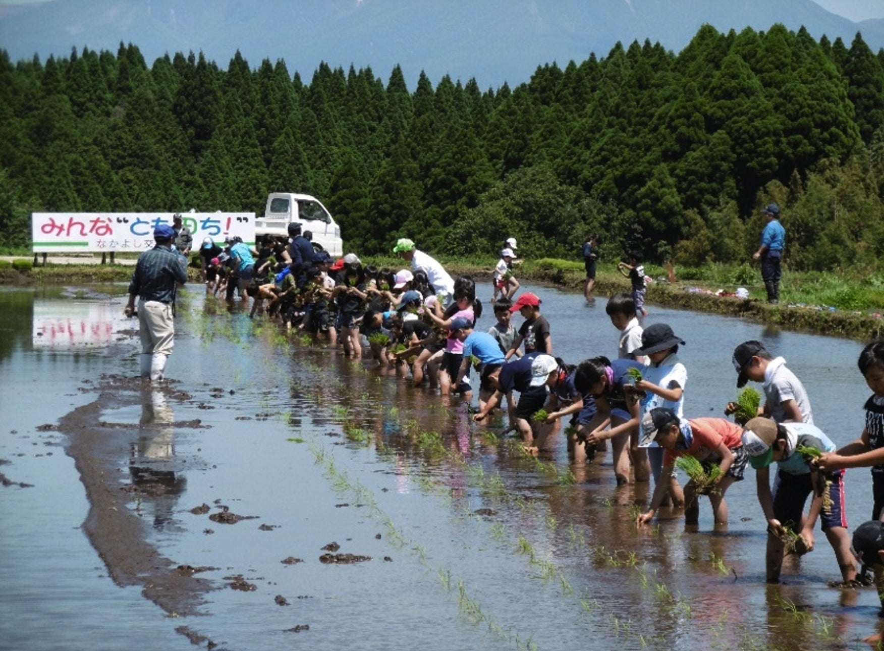 荻町の子ども達と合流して、みんな一緒に泥んこになって一本一本、米の苗を植えていくところがこの大しめ縄のスタートです。