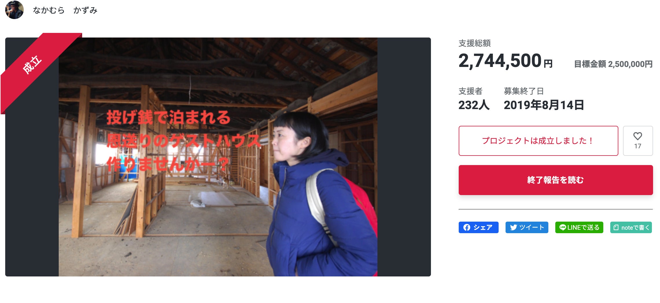 2021/11/19 21:10こんにちは!はじめまして。ページをご覧いただきありがとうございます。なかむらかずみと申します。今回のクラウドファンディングの記事作りを担当しています。2017年に縁もゆかりもない佐伯市に移住してきて、地域おこし協力隊として3年間市役所で働いていました!現在は佐伯市内でゲストハウスを経営しています。2019年に、空き家を改修してできあがったゲストハウスです。開業時に、借入だけでは改修費用が足りず、250万円目標のクラウドファンディングを実施しました。佐伯の人をはじめ、本当にたくさんの方に支援していただき、ありがたいことに270万円ものお金が集まりました。たくさんの人に応援していただき、資金調達が目的だったにも関わらず、『一歩踏み出してみることの大切さ』『人に頼ることの素晴らしさ』『助けてくれる人の温かさ』など数字では決して見えないものを身をもって体験させてもらいました。そして今度は自分が応援する側に自身のクラウドファンディングの経験をきっかけに、「クラウドファンディングをもっともっと気軽にしていい世の中にしたい」と思いました。だけど、そこには何かをやってみたい、と思う人の気持ちとやる気、人やお金を集められるだけの魅力がなければ何も始まりません。「やってみたい」と思う人「応援したい」と思う人がいて、初めて成り立ち、それが金額という数字として見える。すごく面白いし、それで「やってみたい」ことが実現できたらこの世界はもっともっとワクワクする。だから、この豊後二見ヶ浦の遊歩道整備のクラウドファンディングについて実行委員会から相談があった時、すぐ「やりましょう!」と答えました。こんなにたくさんの人の歴史と気持ちを背負った場所のアップデート!どんどんしたい!もちろん、何を始めるにも困難は絶対にあるけど、困難に目を向けて「できない、ショボーン」となってしまってはつまらない・・・。担当の方が「やってみたい」と私に相談に来てくれたのだから、私なりに全力出そうと思います!ーーーーーーーーーーーーーーーーーーーーーーーーと、記事本文を作りました!写真を撮りに行き、取材に行き、編集して、修正して大切にできあがった記事です。が、このクラウドファンディングが募集を始めて数日・・・あれれ?全然支援が集まらない。友人に相談したところ「中の人が見えない」「結局、誰のことを応援しているのかが見えない」と言われてしまいました。ガビーン。何度も何度も読み返し、書き直して作ったはずのページだったけれど・・・確かに!たくさんの立場の人が関わり、チームで動いていることのデメリットの部分が露呈してしまっていました。豊後二見ヶ浦の歴史や、現状はわかる記事だけど「今」「誰が」挑戦しているのかが見えてこない。そこで・・・チームのメンバーを紹介していくことにしました!『活動報告』の場を借りて、「中の人たち」の声をどんどん発信していこうと思います。一人でも、「この人のためなら」と思える人を見つけたら、ご支援をお願いいたします! もっと見る
