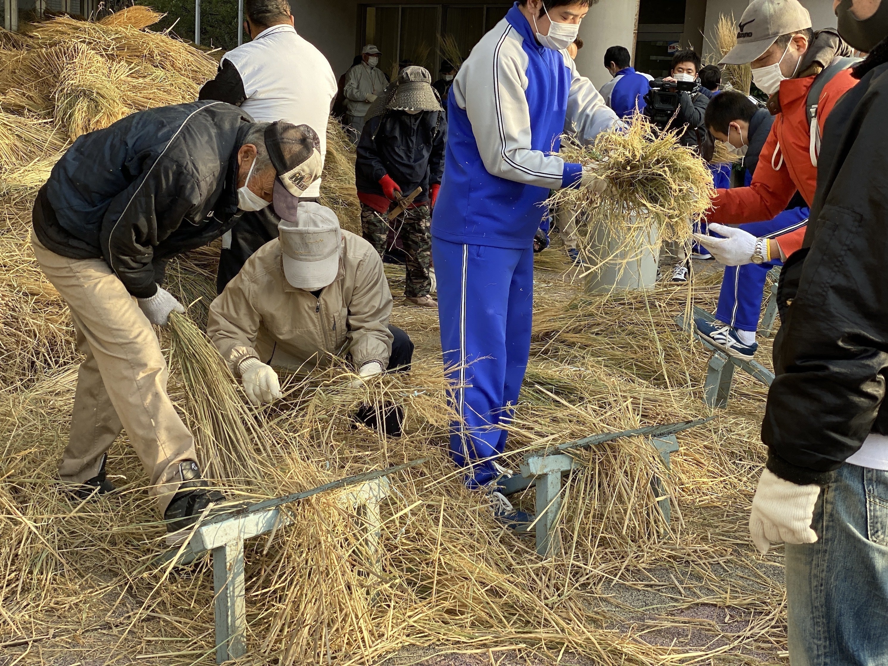 新年の日の出を新しい大しめ縄で迎えられるよう年末の寒い中、地域の人を中心に、たくさんの人々が作業に参加してくれています。