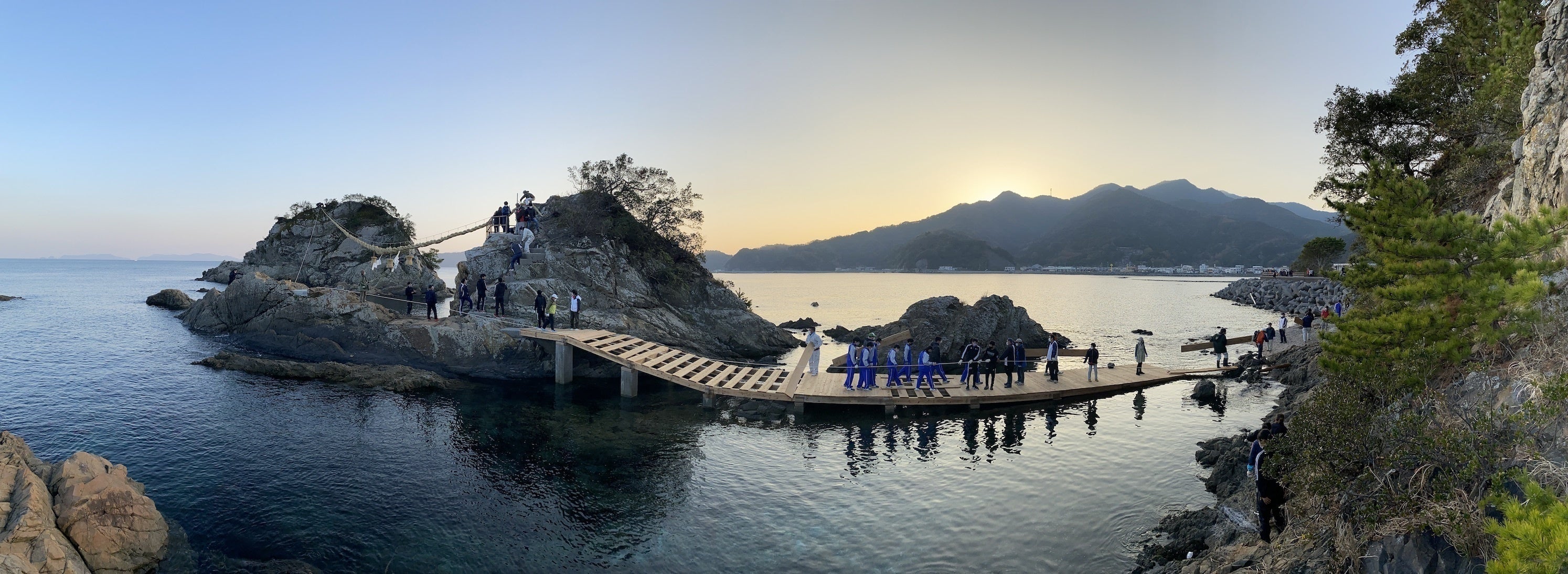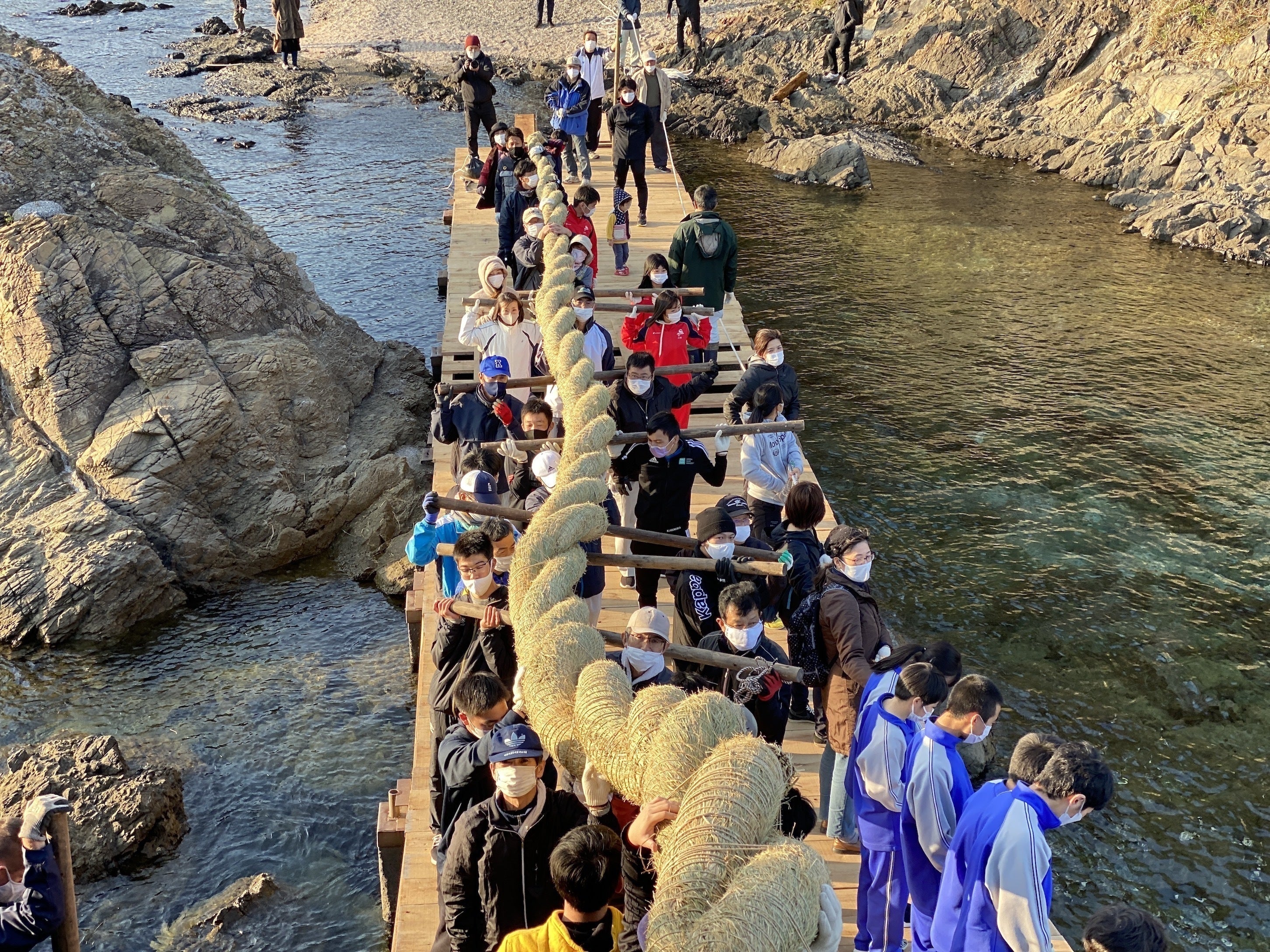 海から飛び出た2つの岩にしめ縄を張り直すため、毎年『作業用の仮設橋』をかけていますが、