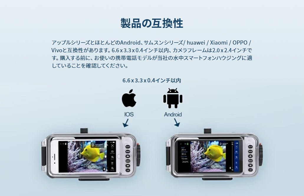 深度アラーム機能や、撮影時に役立つ照明機能が搭載され、お手持ちのスマホが、即座にダイビングコンピュータへ早替わり。いままでのようにダイブコンピューターやコンパス、カメラなどを持ち運ぶ負担が一気になくなりました。