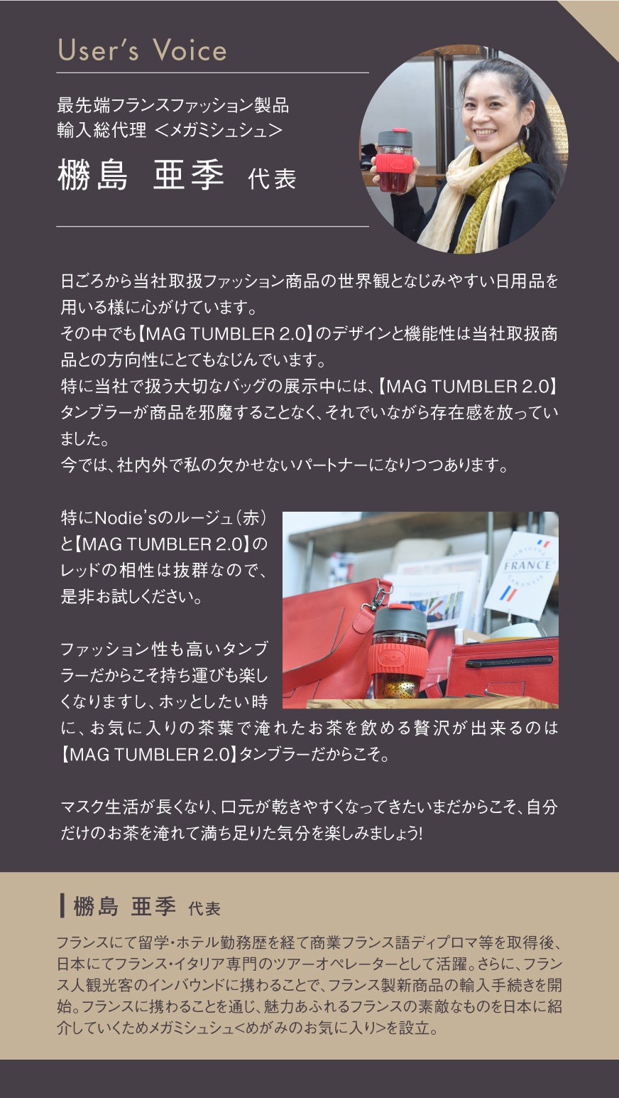 実際に最先端フランスファッション製品輸入総代理<メガミシュシュ>の橳島代表に【MAG TUMBLER 2.0 】を使って頂いた感想をご紹介いたします。