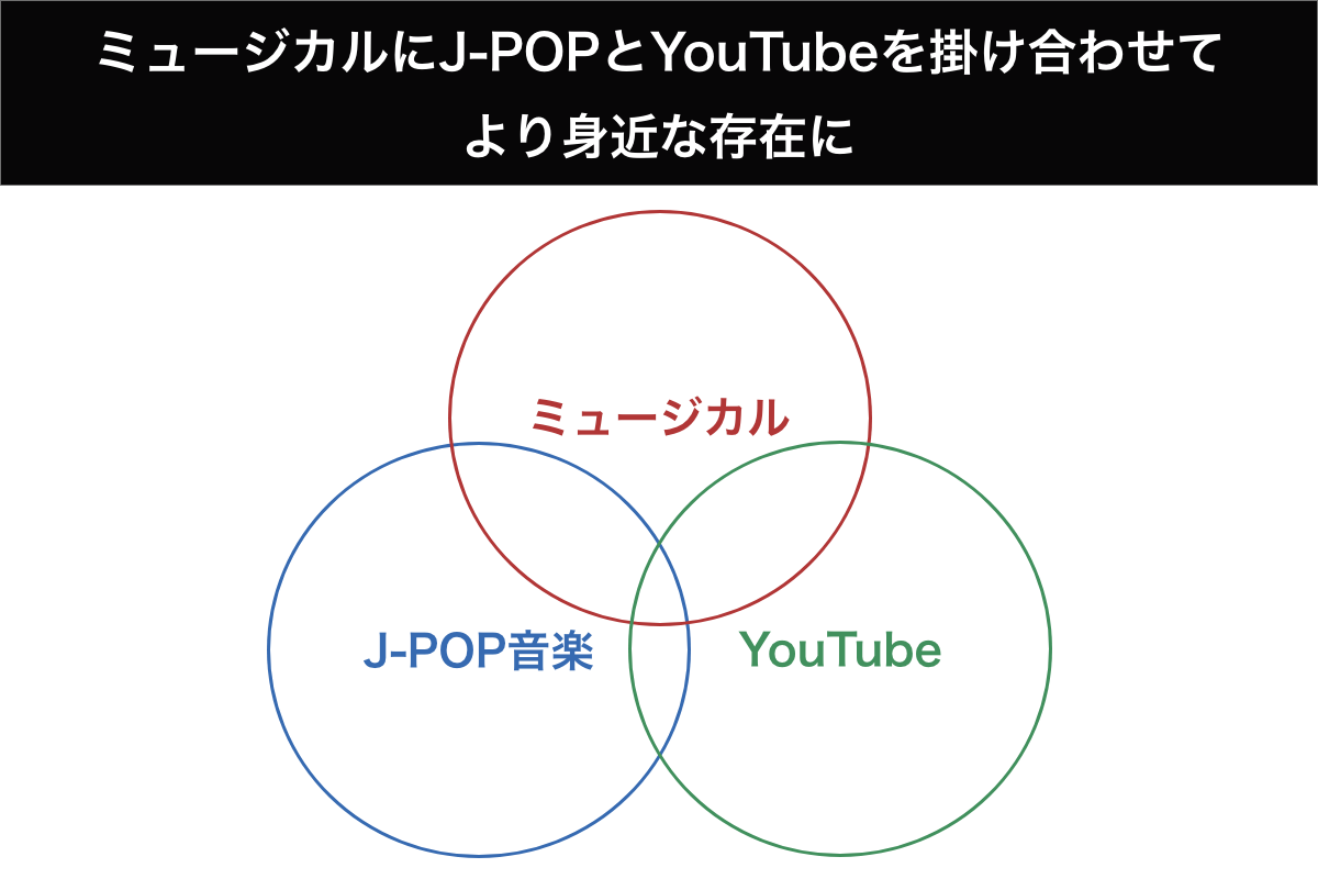 日本人の身近にあるJ-POP音楽を使用したジュークボックスミュージカル短編作品を製作、自宅で・無料で観られるYouTubeで配信することで、多くの人に気軽にミュージカルの魅力を知っていただく機会を作れるのでは?と今回のプロジェクトへの挑戦に至りました。