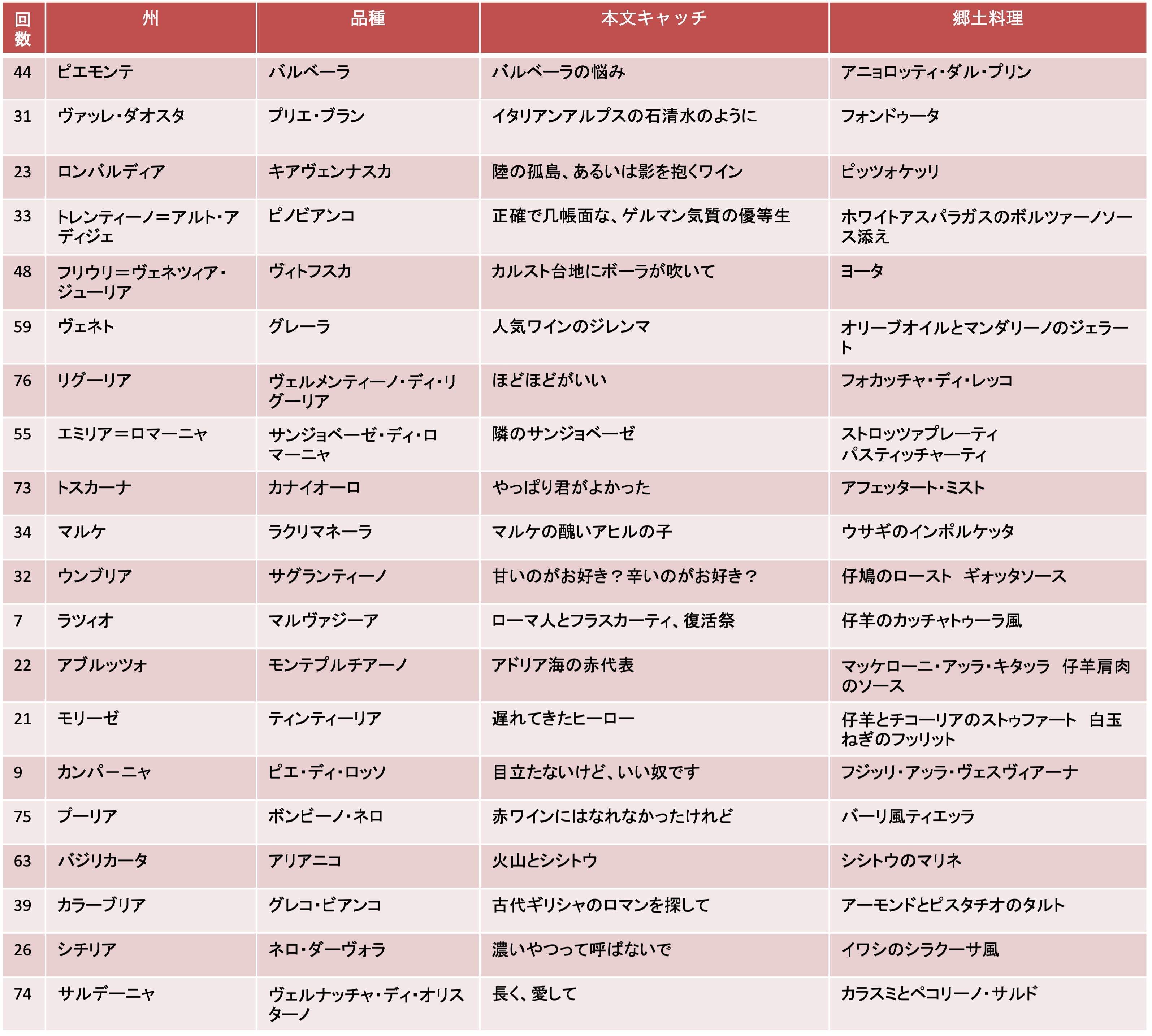 3章で取り上げる州ごとの土着ブドウ品種の例です。(回数は連載の回数です)本文キャッチは、毎回楽しみながら考えていました。74回目は内藤さんが亡くなられる直前回となってしまいましたが、「長く、愛して」は、忘れがたいキャッチとなってしまいました。