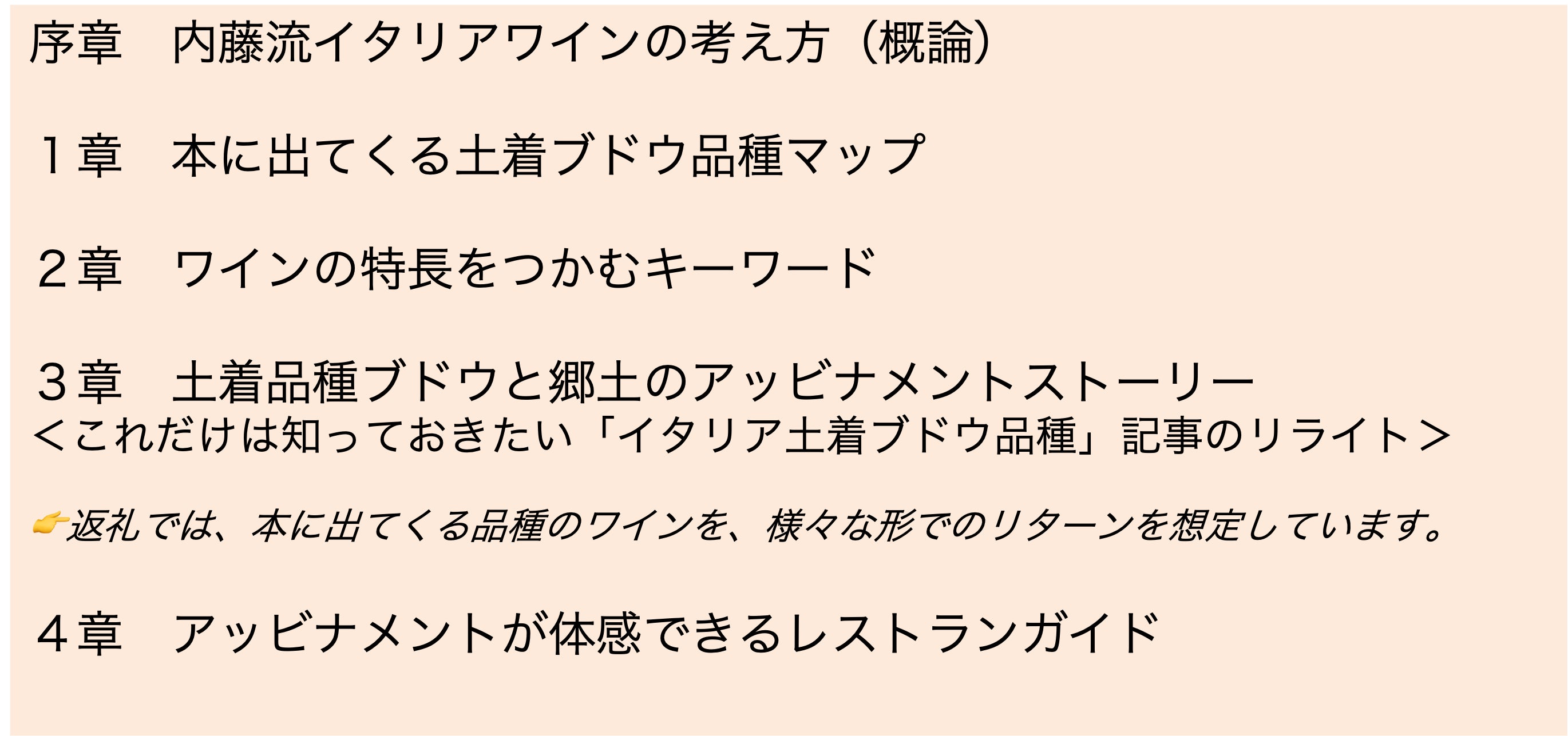 ●完成本10冊セット(25,000円)というコースがありますが、こちらはイタリア料理店やイタリア料理教室、イタリアワインショップのオーナー様を想定しており、お店や教室でお客様や生徒さんに本を販売いただければとの想定で、ほぼ本代金の想定となっています。内藤さんをご存知の料理店、イタリア料理教室のオーナーの方には、本が発売された頃、皆で時期を合わせてイタリア土着品種ワインと料理を合わせるイベントや教室などができたら良いと考えています。こちらはあらためてお知らせいたします。