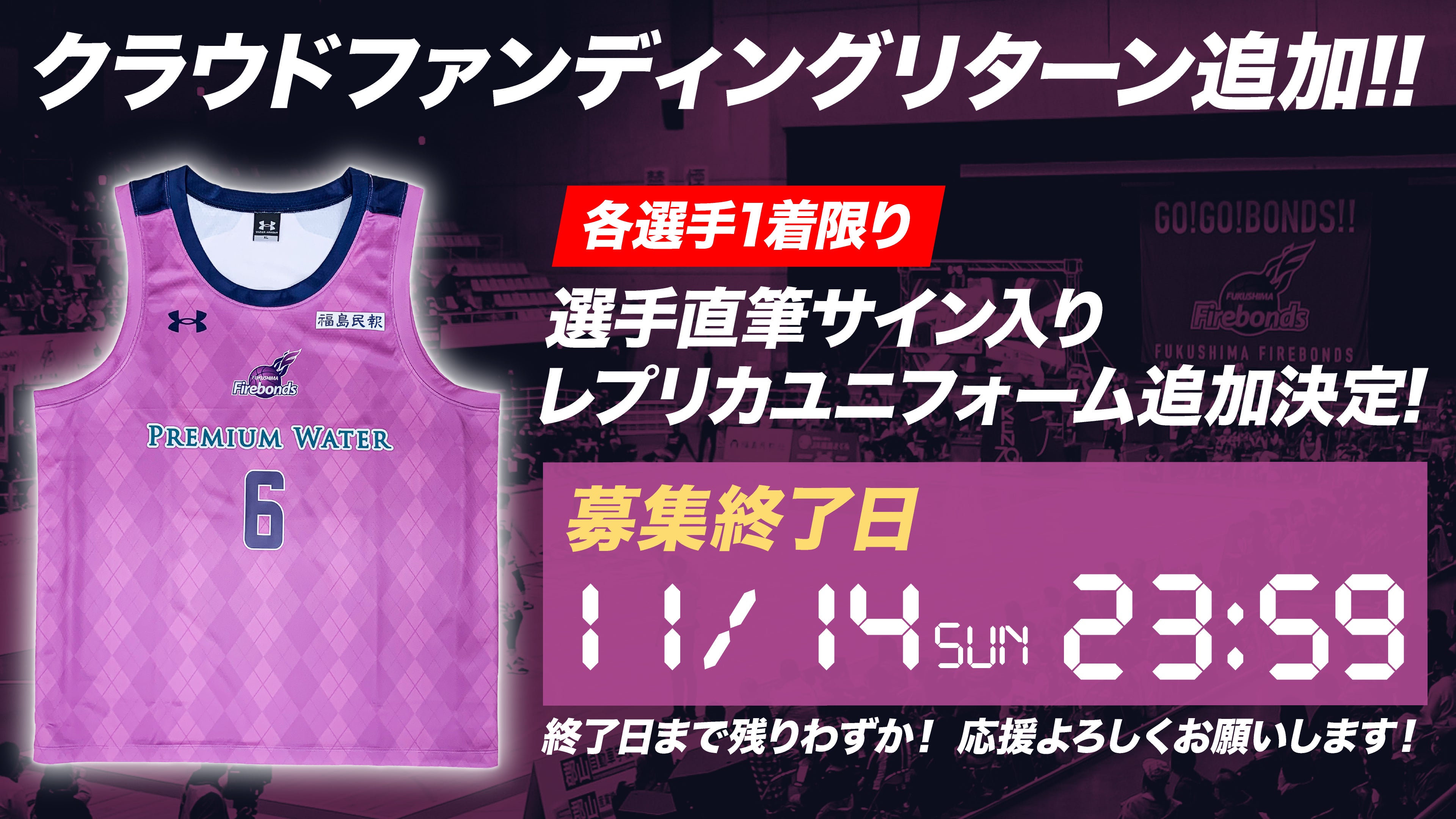 【終了まであと10日!全力ラストスパート!】 本日で、ついに終了まで10日になりました!皆様からのご支援により、現在290万円に到達しております!これまでにご支援してくださった方・情報の拡散にご協力いただいている方本当にありがとうございます。しかし、目標を達成するには、あと一歩皆様のお力が必要です。既に支援をしてくださっている方、情報の拡散にご協力いただいている方も、ぜひ、もう一度クラウドファンディングページをご覧いただき、「BONDS UP」へ込めた 想いの拡散、そして、このクラウドファンディングでしか手に入らない限定リターンの追加のご支援どうかよろしくお願いいたします。残り10日ラストスパートをかけて頑張っていきたいと思います。引き続きのご支援・拡散をよろしくお願いいたします! B2優勝&B1昇格、そして先頭に立ち『誇れる福島』の未来を県民の皆さまと共に創出する決意表明の「第一歩」を踏み出さるようよろしくお願いいたします!