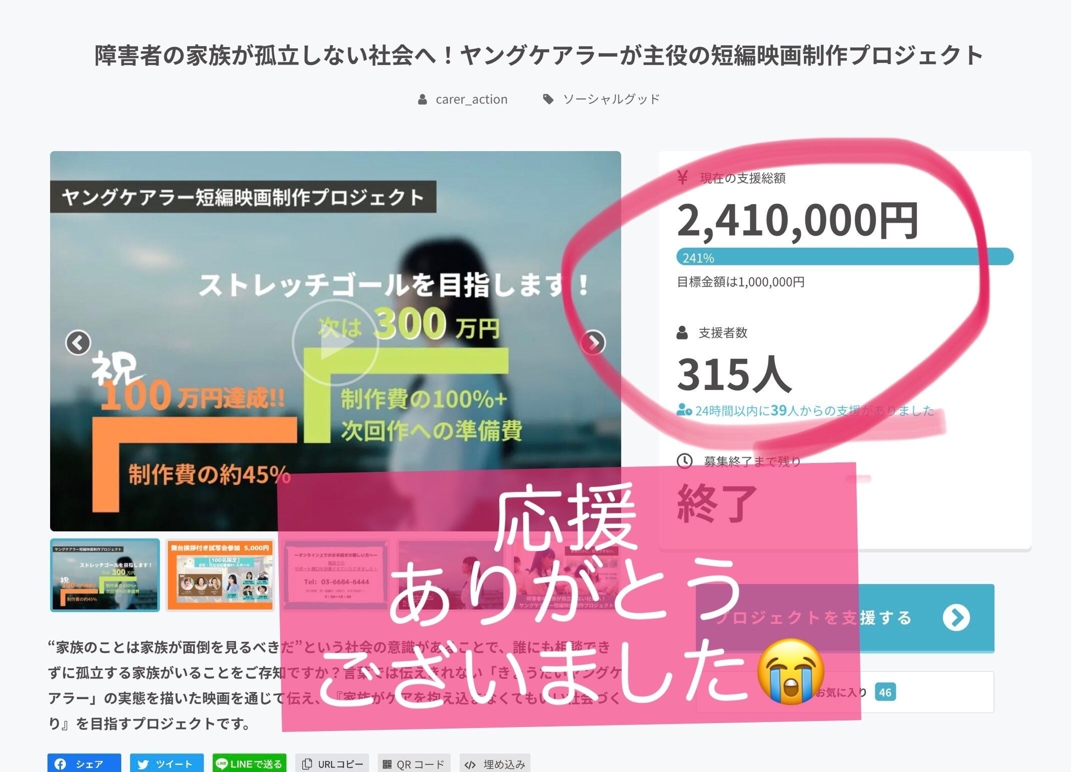 ご支援いただいた皆様へ 昨日23:59を持って私たちの30日余りの挑戦が一旦、一つの幕を閉じました!! 映画を届けていくことはまだまだこれからではあるものの、 クラウドファンディングでは、最後の最後までご支援者が途切れずにおりまして、本当に本当に、有難うございました! 応援いただいたお一人お一人のおかげでございます! 最終的にご支援合計金額は315名のご支援者の方から2,410,000円となりました。 これだけの人数と金額が集まったことに、それだけ「ヤングケアラー」に注目が集まり、世間の気持ちが向いているんだな、と思うと、感激もひとしおです! この30日あまりの映画制作プロジェクトのクラウドファンディングでお力をお貸しくださいました全ての皆様に改めて、感謝申し上げます。 CANクラウドファンディングチームメンバー一同