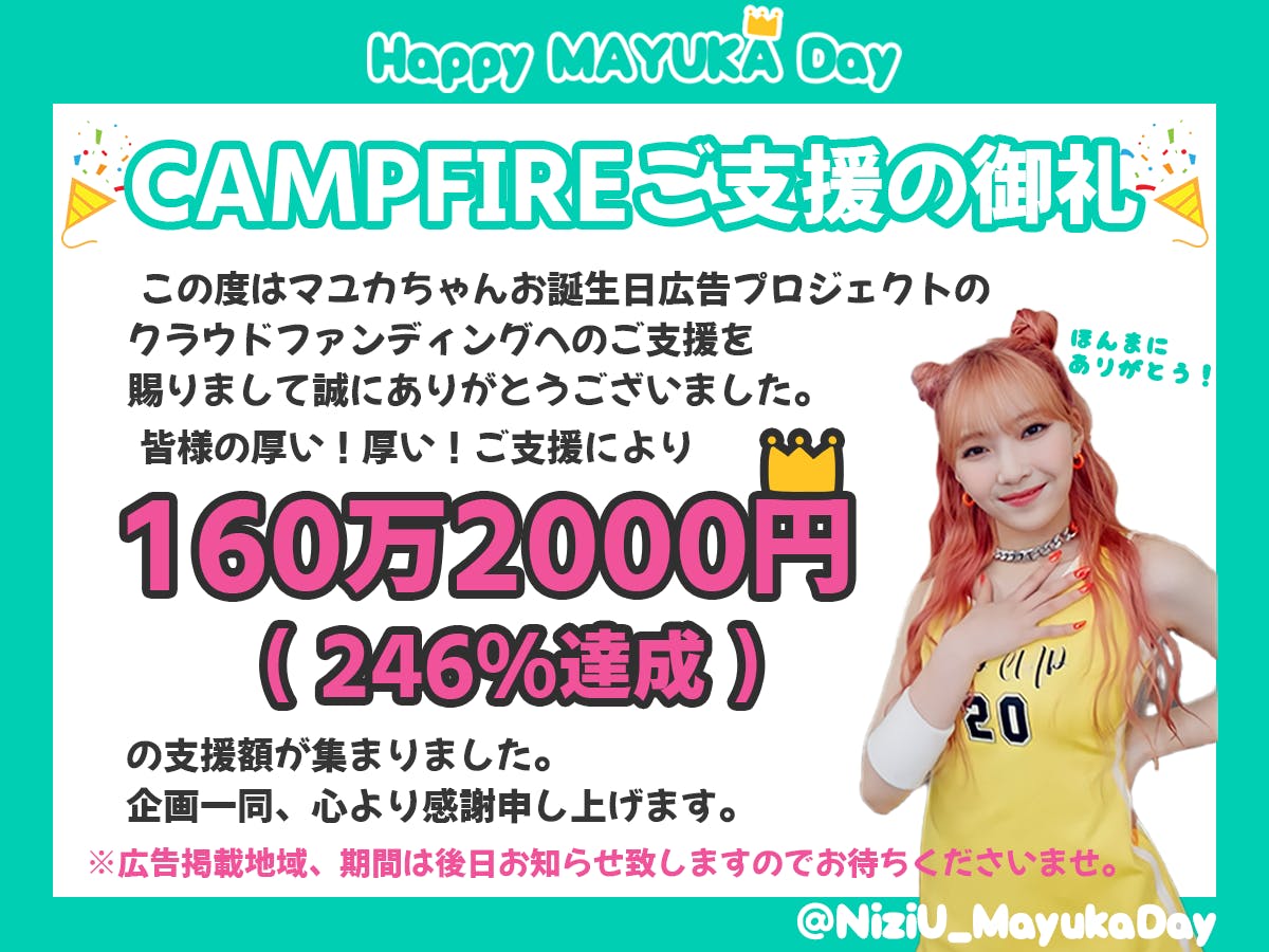 2022/10/01 10:00WithUの皆さまこの度は本プロジェクトにご支援いただきまして、誠にありがとうございます。皆さまの厚いご支援のおかげで、無事に目標金額を達成することができました。運営一同、心より感謝申し上げます。広告掲載地域につきましては現在調整中のため、後日ご連絡いたします。引き続きプロジェクト成功に向けて尽力して参りますので、どうぞ宜しくお願いいたします。NiziUマユカお誕生日企画 もっと見る
