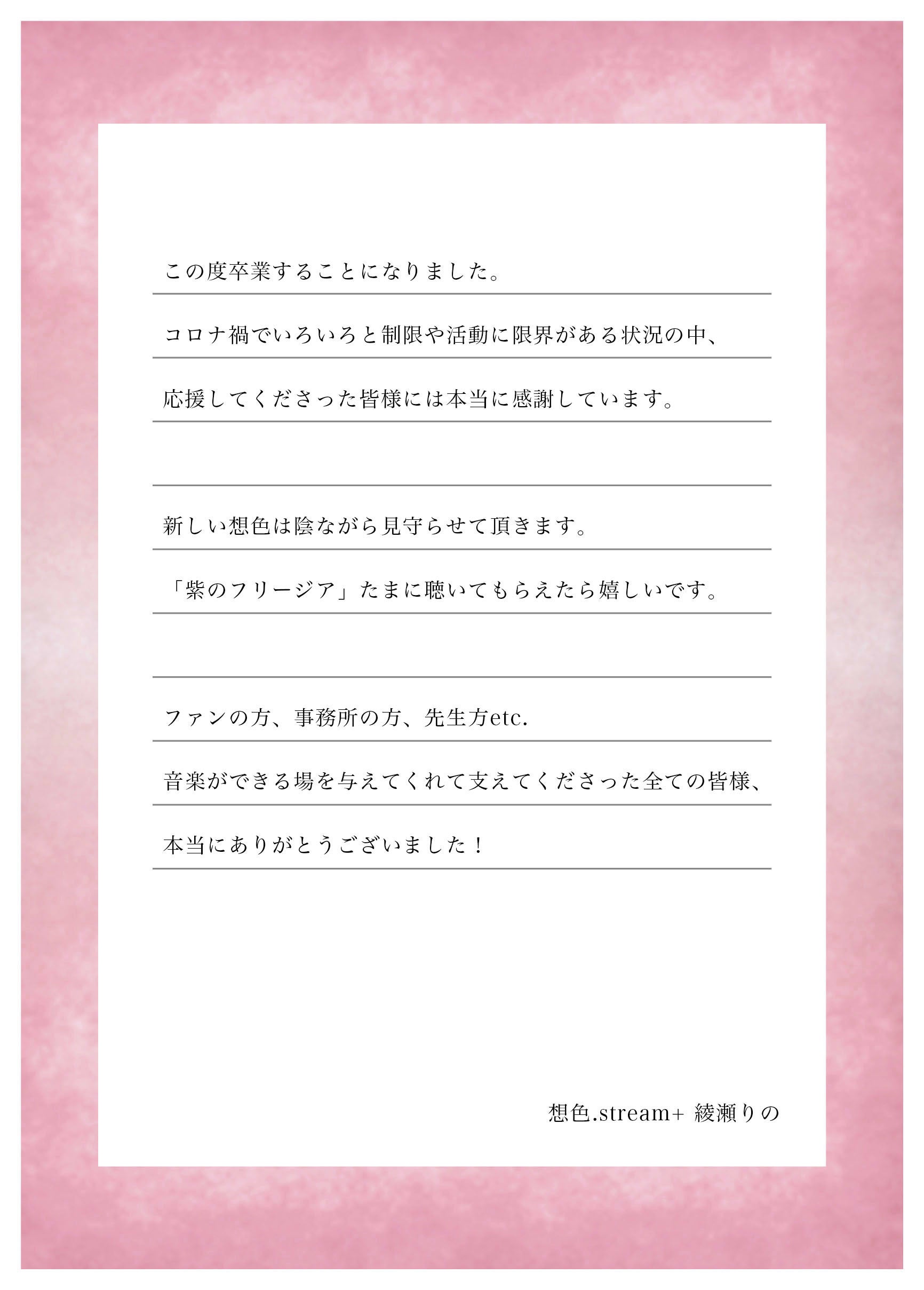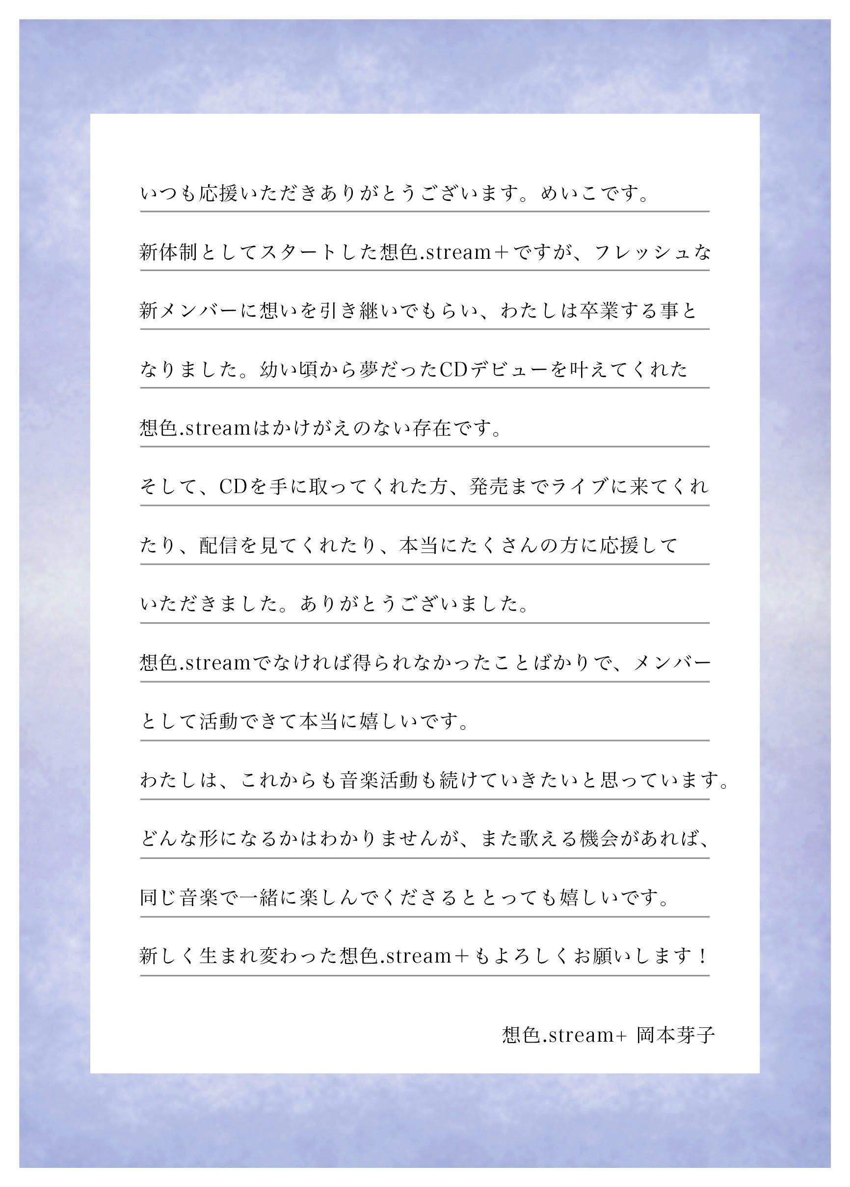 これまで想色.streamの初期メンバーとして頑張ってきてくれた、綾瀬りの、岡本芽子の2人から、新メンバーに想色を引き継いでグループを卒業したいとの申し出がありました。