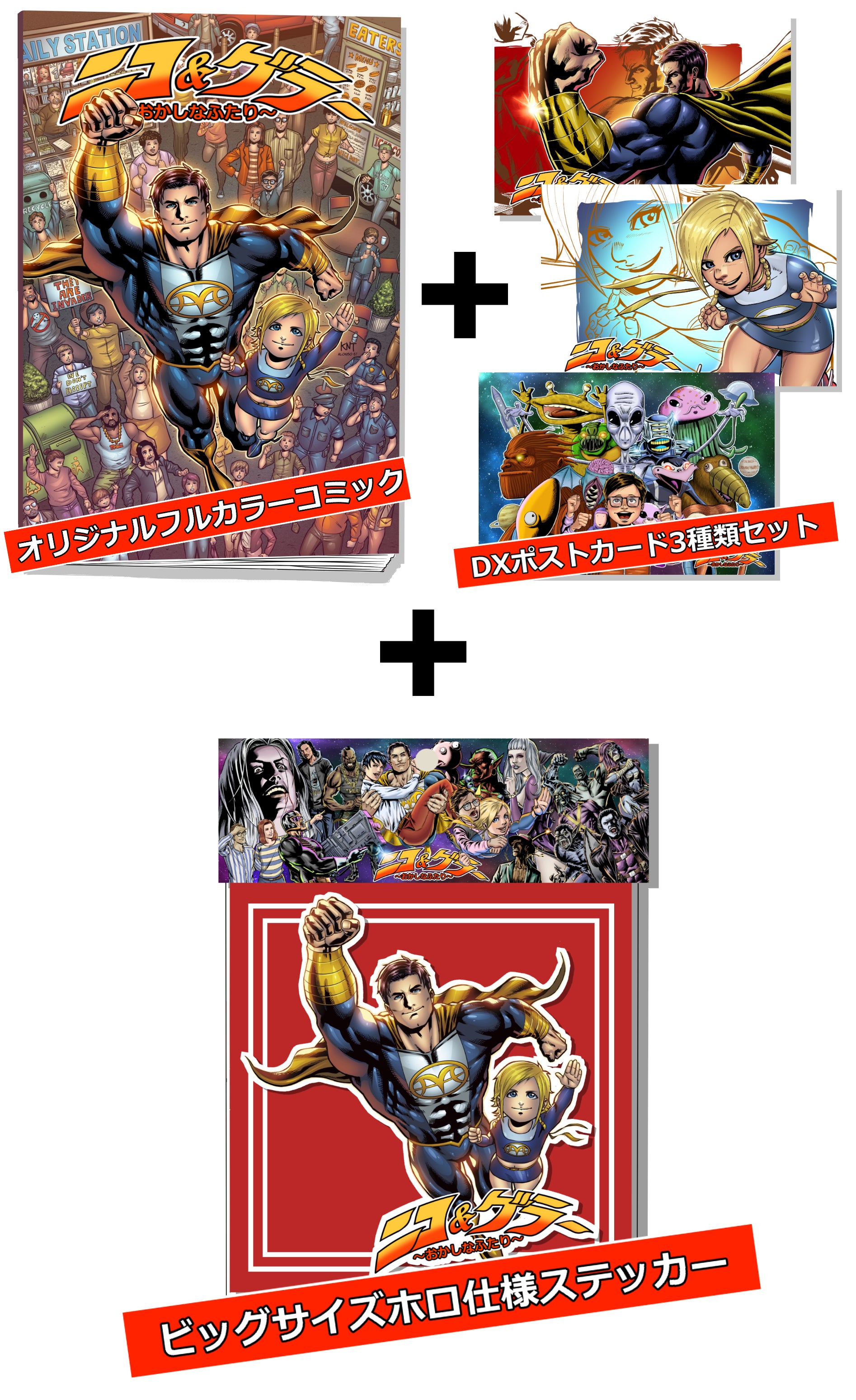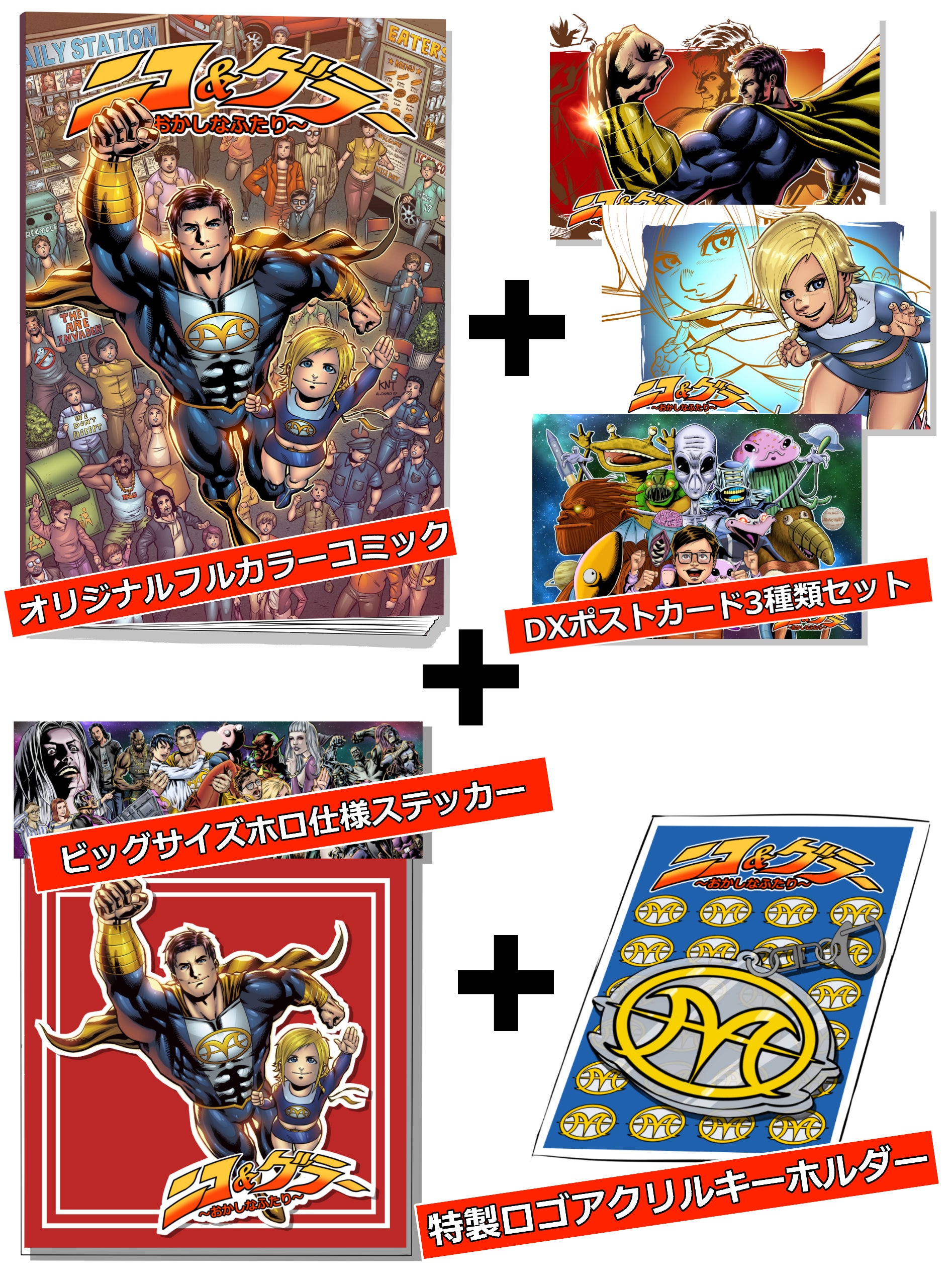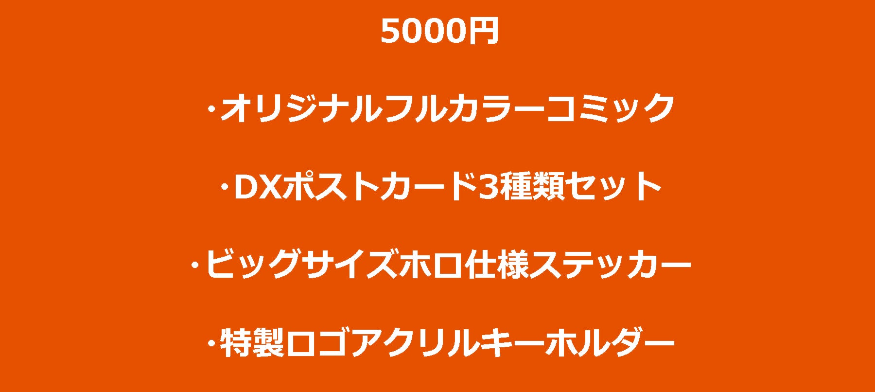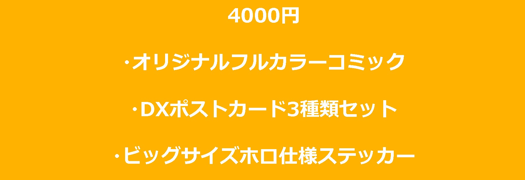 みんなの応援によって完成したコミックと、DXポストカード3種セットと、ビッグサイズホログラムステッカーと、オリジナルロゴアクリルキーホルダーを発送するよ。