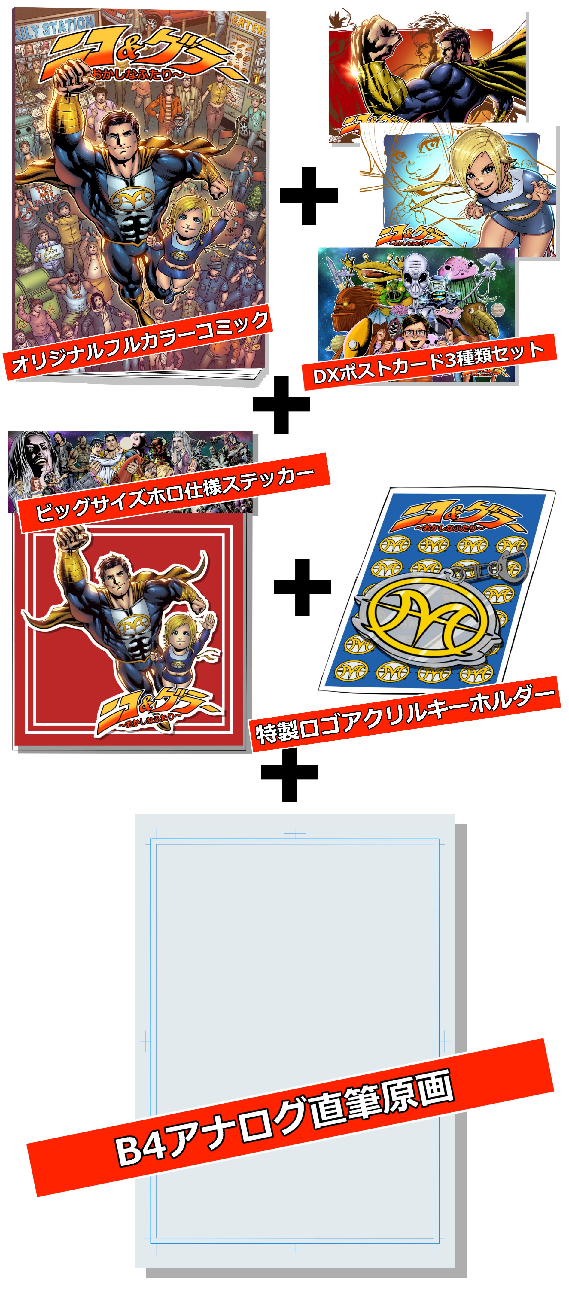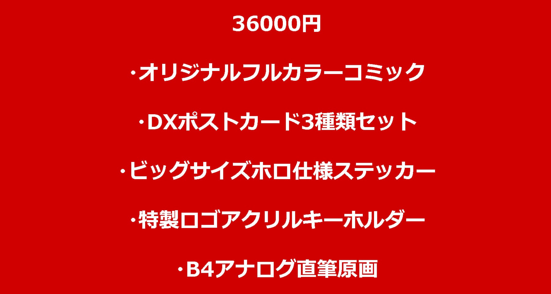みんなの応援によって完成したコミックと、DXポストカード3種セットと、ビッグサイズホログラムステッカーと、オリジナルロゴアクリルキーホルダーと、B4アナログ描きおろし特製原画を発送するよ。