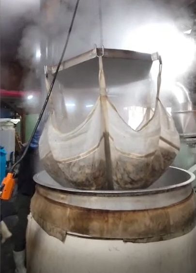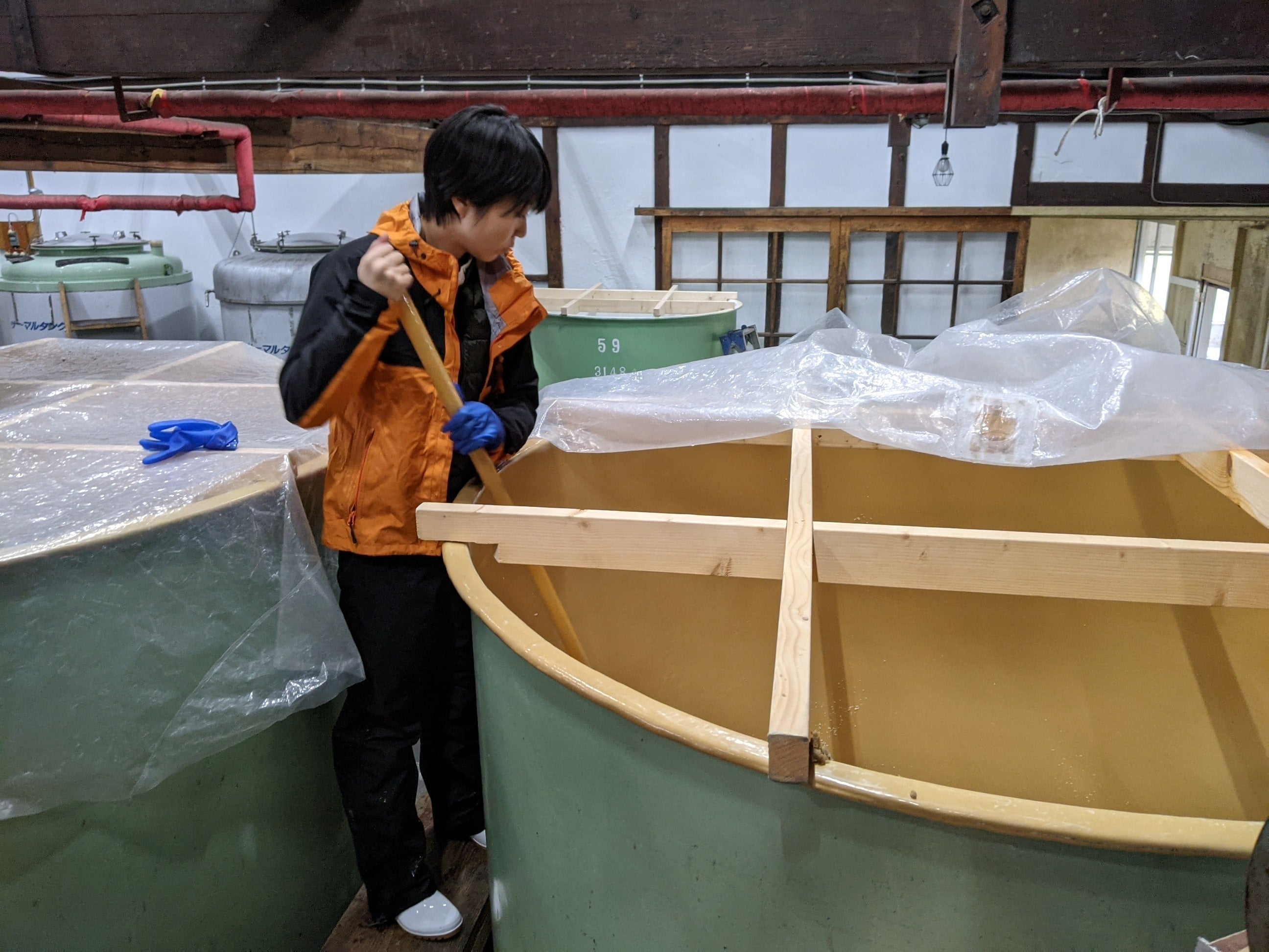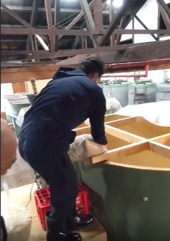 造って下さった米麹を樽に投入。トレーナーは選手だけでなく米の調子も見てくれます。