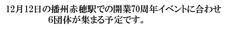 具体的な実施計画はこれからですが当日は播州赤穂駅周辺で開業70周年イベントを行い、赤穂城跡でマルシェを開催しお城通り周辺でコスプレイベントと広いエリアで行い、町全体を盛り上げようとする計画です。