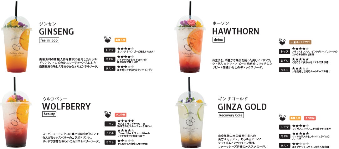 ・ルーツ漢方ドリンクを自宅でお楽しみ頂ける様、様々なフルーツやハーブと漢方薬の原料となる高麗人参、クコの実、山査子を掛け合わせたドリンクシロップを4種類準備しております。
