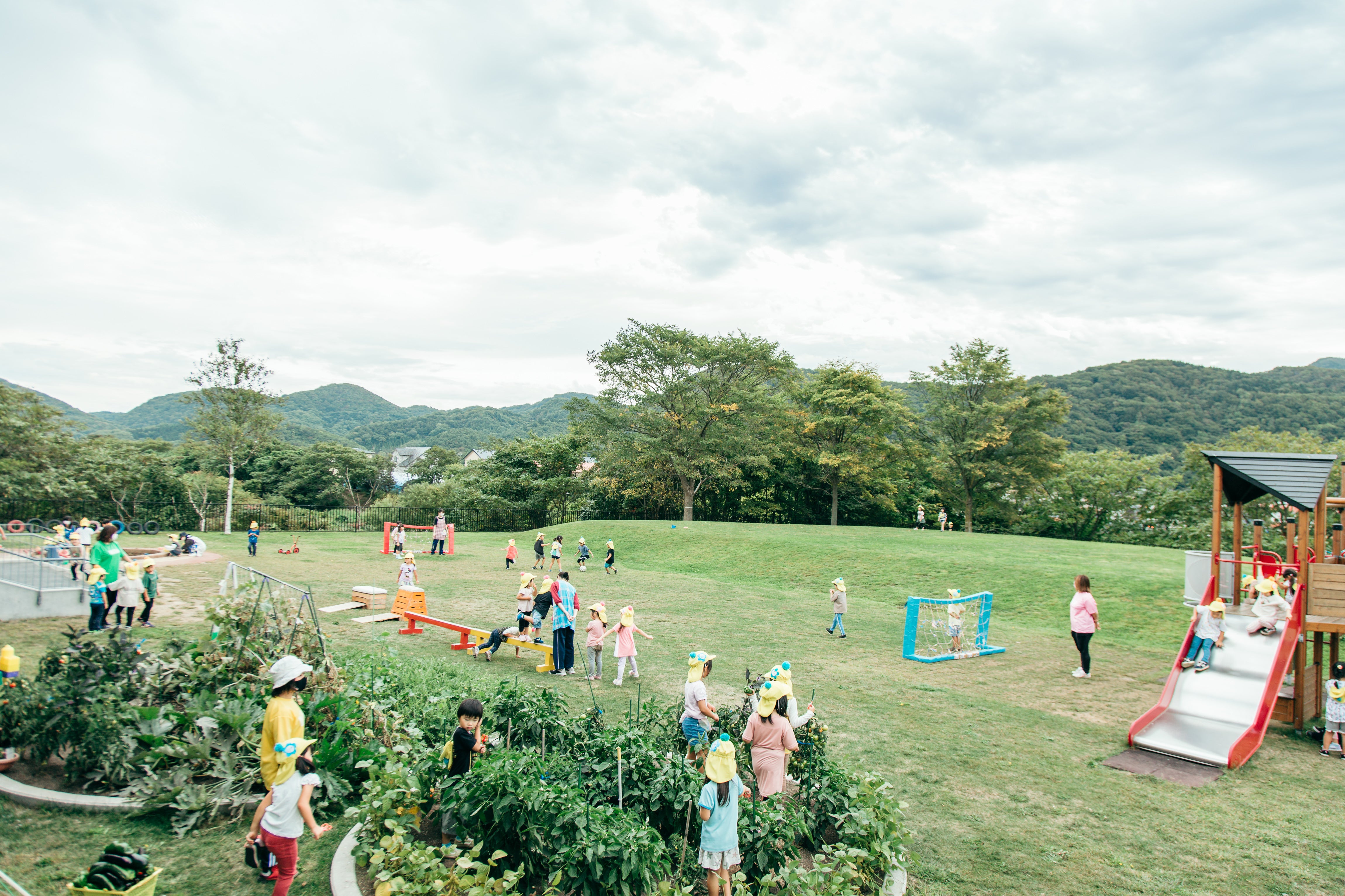 はぜるでは公園の芝生や築山をそのまま園庭として活用しています