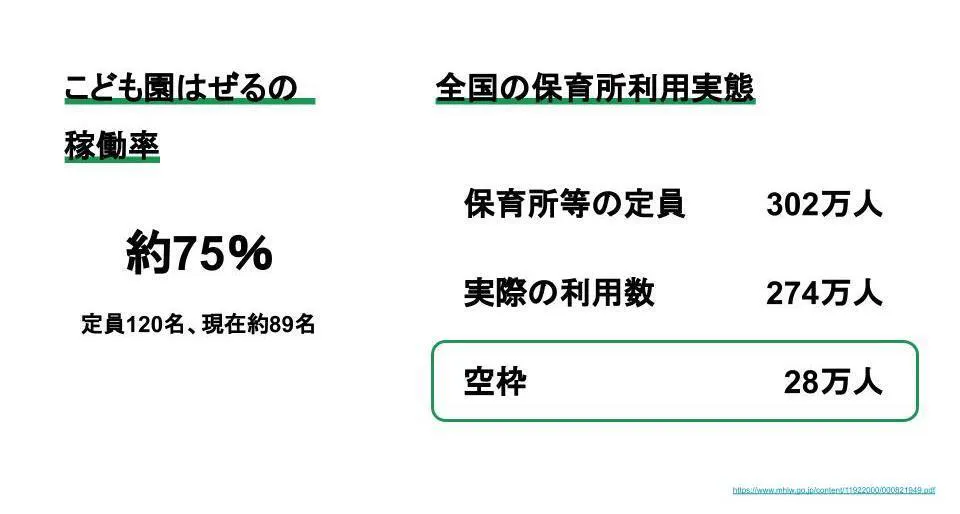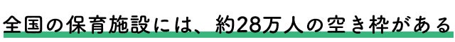 さらに社会に視野を広げてみていきます。データをみてみると、全国には約28万人の保育施設の空き枠があることがわかります。とくに地方では、まだまだ活用できる保育資源が余っているような状態です。