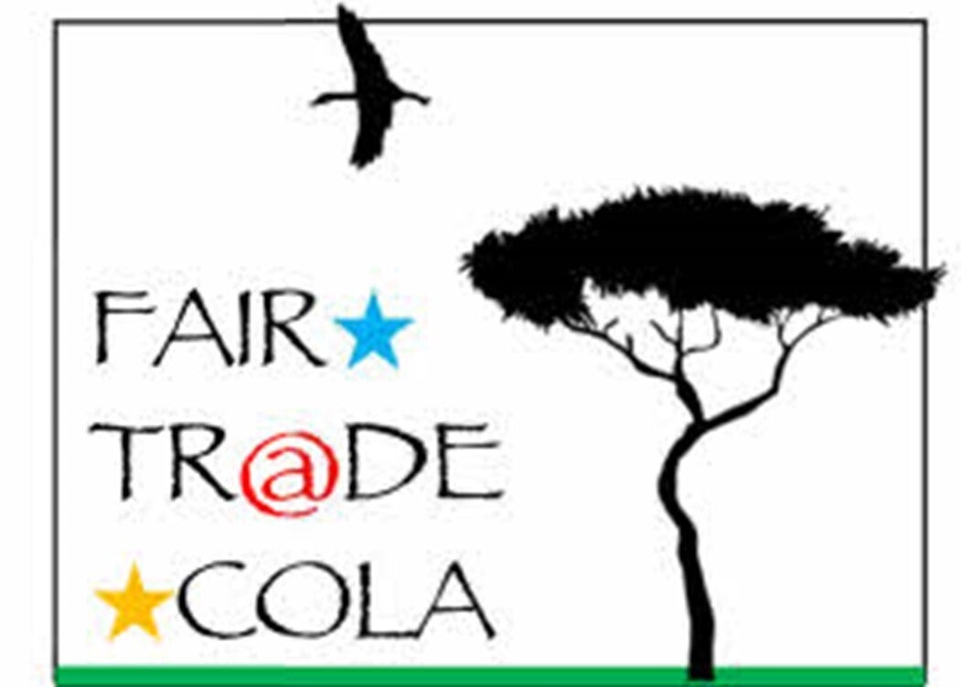 新旧ラベルです私達はこの新しいコーラをFAIR★TR@DE★COLAと命名しました。「フェアトレード」とは公平な取引と言う意味ですが、単純に途上国の認定産物を買っていますというだけでなく、広い意味でお客様に対しても、購入先に対しても、そして作る立場に対しても「公平な取引」を実行する事を誓う意味から名づけました。ラベルの緑の下線はサバンナの草原を表しています。樹木の上をフラミンゴが羽ばたいています。ロゴタイプは「パピルス」と言うアフリカをイメージしたフォントを使いました。赤や黄色などの帯色はアフリカの太陽をイメージしています。是非FAIR★TR@DE★COLAを飲んで頂きコーラナッツの故郷、遠くアフリカに想いを馳せてみて下さい。