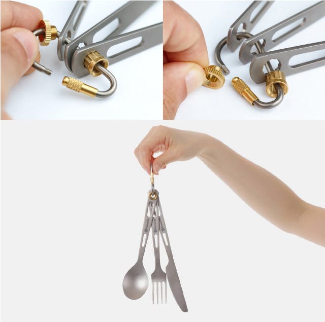 チタンカトラリーにはカラビナ(開閉できる部品付きの金属リング)が付いており、スプーンとフォーク、ナイフをまとめるのも簡単。