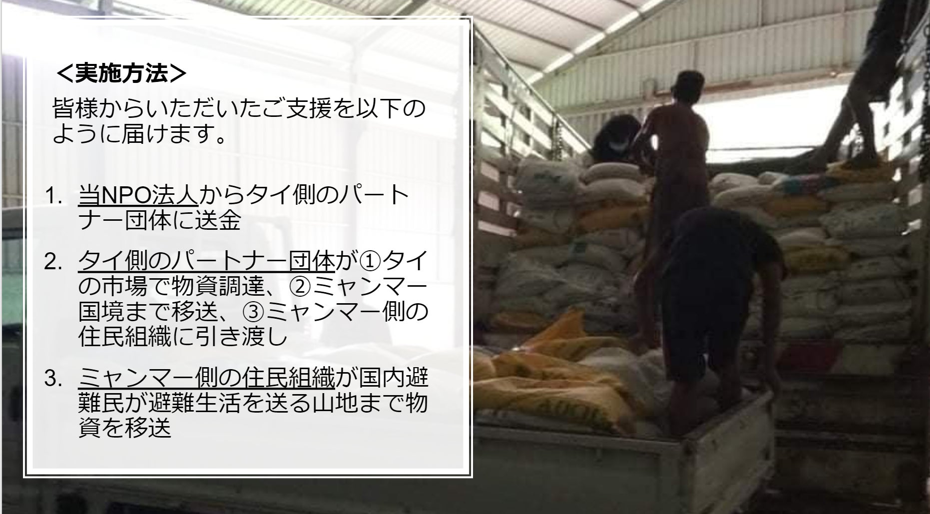 皆様のご支援をタイNPOに送金し、現地で物資を調達したのちに、カレンの住民組織と協力し、国内避難民のもとに物資を届ける予定です。