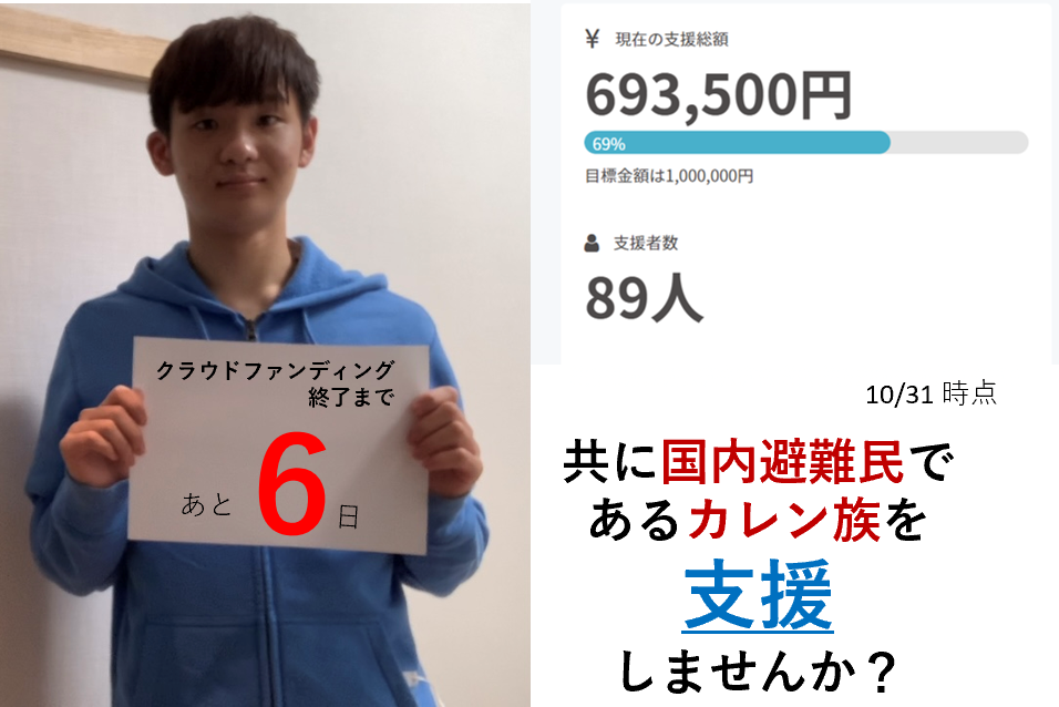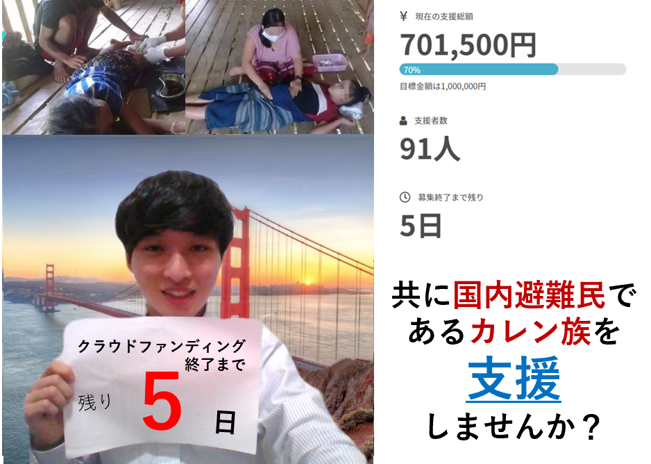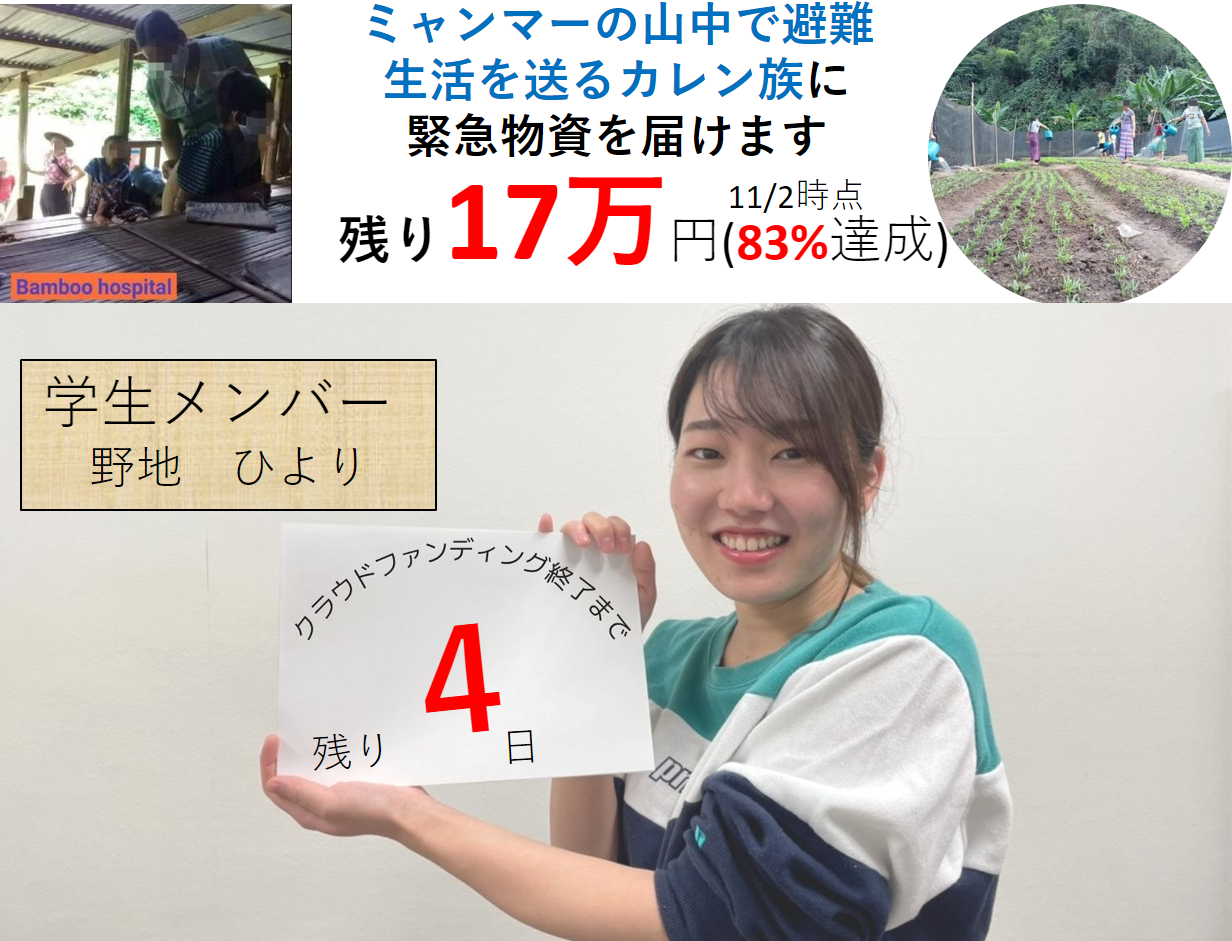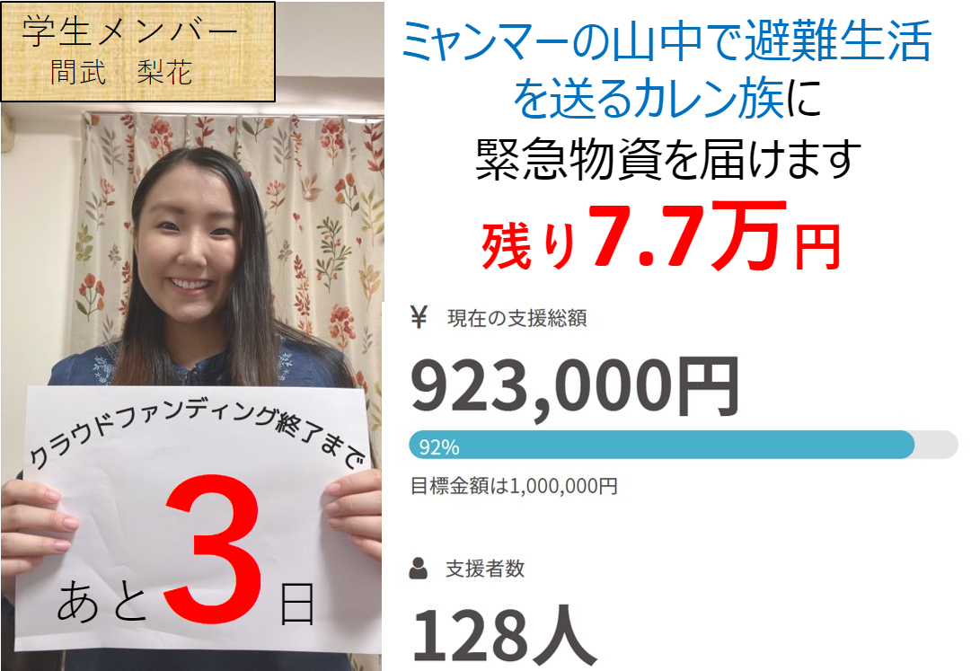 こんにちは、学生インターンの黒田健斗です!クラウドファンディングの方は、3日時点で92%(923,000円)のご支援を皆様からいただいております。これまでにご支援いただいた128名の方々、誠にありがとうございます。本日は私たちのクラウドファンディングに支援していただいた方へ向けてのリターンの紹介をさせていただきます。【1000円以上ご支援】インターバンドよりご支援へのお礼のメールと学生メンバーよりデジタル色紙をお送りいたします。【3000円以上ご支援】上記に加え、活動報告書をメールにてお送りいたします。実際の支援活動や支援後の現地の状況をお伝えさせていただきます。【6000円以上ご支援】メール・色紙・活動報告書に加えて、活動報告会へご招待させていただきます。学生インターンが現地からの報告を受けて、詳しくお話できればと考えております。【10000円以上ご支援】上記のリターン+支援者交流会へのご招待をさせていただきます。私たちの活動の支援者同士の交流を通して、ミャンマーのために様々な意見交換やアクションを起こすきっかけになればと思います。【15000円以上ご支援】上記のリターン+支援地域であるキャンプで生活をしている国内避難民の方からのお礼の手紙をメールにてお送りさせていただきます。【20000円以上ご支援】上記に加え、ミャンマーでこれまで国際支援や活動を行ってきた有識者をお呼びしたトークイベントにご招待させていただきます。支援という観点からミャンマーに何が必要か考える、そんなイベントになればと考えております。クラウドファンディングも残り3日となりました。これまでご支援いただいた皆様には感謝申し上げます。2か月の食糧を支援できる目標まであと少しです!皆様のご支援が国内避難民の希望となります。ぜひ情報の拡散のほど皆様よろしくお願いいたします。